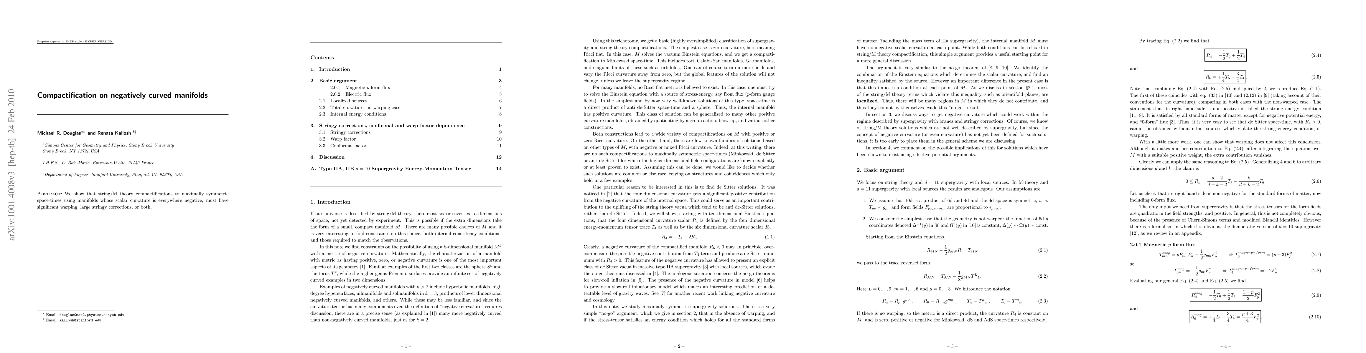 The paper demonstrates that string/M theory compactifications to symmetric space-times via negatively curved manifolds necessitate substantial warping or considerable stringy corrections due to the negative scalar curvature throughout.