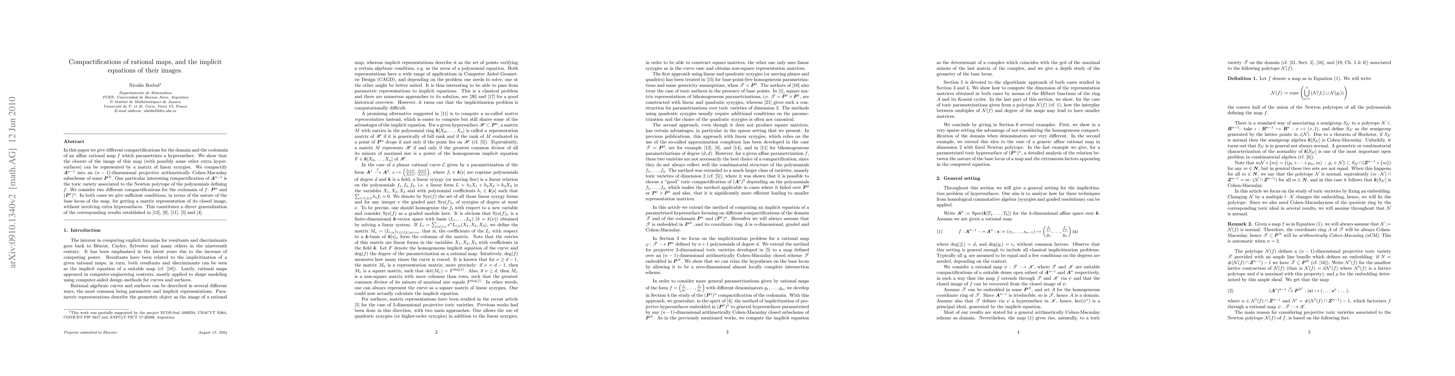 In this paper we give different compactifications for the domain and the codomain of an affine rational map $f$ which parametrizes a hypersurface. We show that the closure of the image of this map (with possibly some other extra hypersurfaces) can be represented by a matrix of linear syzygies. We compactify $\Bbb {A}^{n-1}$ into an $(n-1)$-dimensional projective arithmetically Cohen-Macaulay subscheme of some $\Bbb {P}^N$. One particular interesting compactification of $\Bbb {A}^{n-1}$ is the toric variety associated to the Newton polytope of the polynomials defining $f$. We consider two different compactifications for the codomain of $f$: $\Bbb {P}^n$ and $(\Bbb {P}^1)^n$. In both cases we give sufficient conditions, in terms of the nature of the base locus of the map, for getting a matrix representation of its closed image, without involving extra hypersurfaces. This constitutes a direct generalization of the corresponding results established in [BuseJouanolou03], [BuseChardinJouanolou06], [BuseDohm07], [BotbolDickensteinDohm09] and [Botbol09].