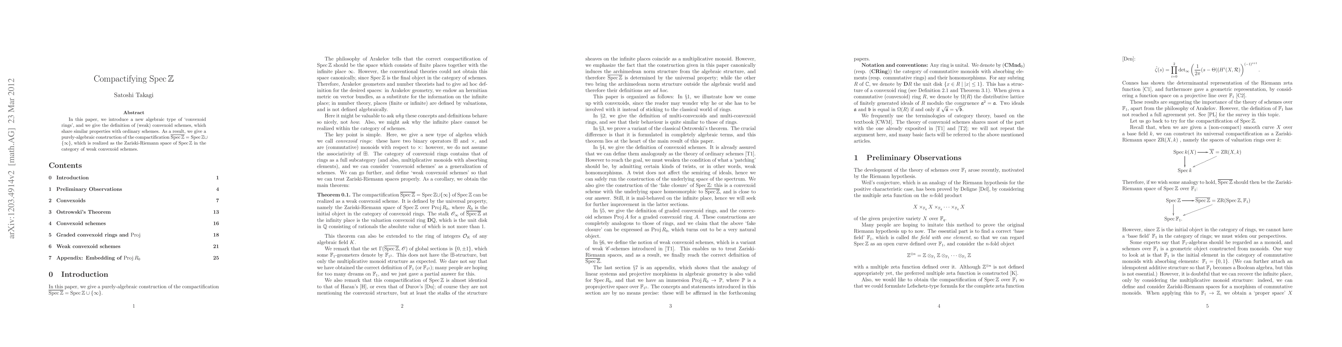 This paper introduces a novel class of "convexoid rings" and defines (weak) convexoid schemes, which exhibit properties akin to ordinary schemes. The authors provide a purely algebraic method for compactifying Spec Z in Arakelov's sense, realized through the Zariski-Riemann space within the framework of weak convexoid schemes.