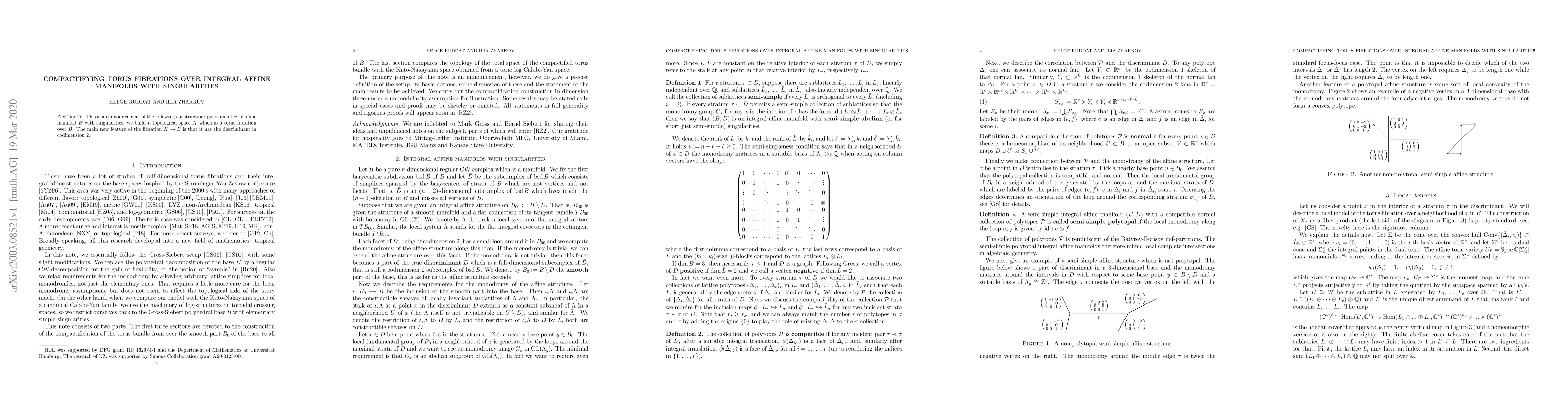 This is an announcement of the following construction: given an integral affine manifold $B$ with singularities, we build a topological space $X$ which is a torus fibration over $B$. The main new feature of the fibration $X\to B$ is that it has the discriminant in codimension 2.