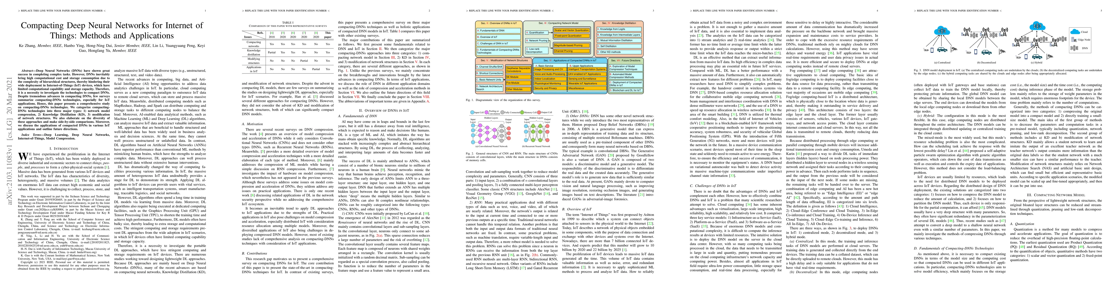 Deep Neural Networks (DNNs) have shown great success in completing complex tasks. However, DNNs inevitably bring high computational cost and storage consumption due to the complexity of hierarchical structures, thereby hindering their wide deployment in Internet-of-Things (IoT) devices, which have limited computational capability and storage capacity. Therefore, it is a necessity to investigate the technologies to compact DNNs. Despite tremendous advances in compacting DNNs, few surveys summarize compacting-DNNs technologies, especially for IoT applications. Hence, this paper presents a comprehensive study on compacting-DNNs technologies. We categorize compacting-DNNs technologies into three major types: 1) network model compression, 2) Knowledge Distillation (KD), 3) modification of network structures. We also elaborate on the diversity of these approaches and make side-by-side comparisons. Moreover, we discuss the applications of compacted DNNs in various IoT applications and outline future directions.