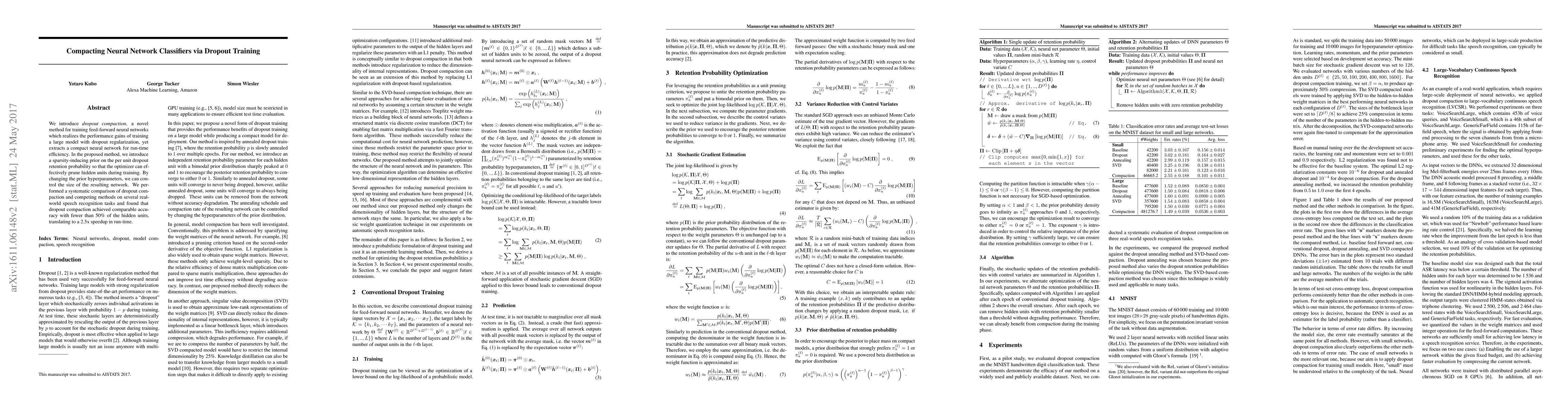 This paper proposes dropout compaction, a technique for training neural networks that achieves the performance of large models with dropout but results in a much smaller, more efficient network. It introduces a sparsity-inducing prior to prune hidden units during training, leading to comparable accuracy with significantly fewer units and a 2.5x speedup in runtime.