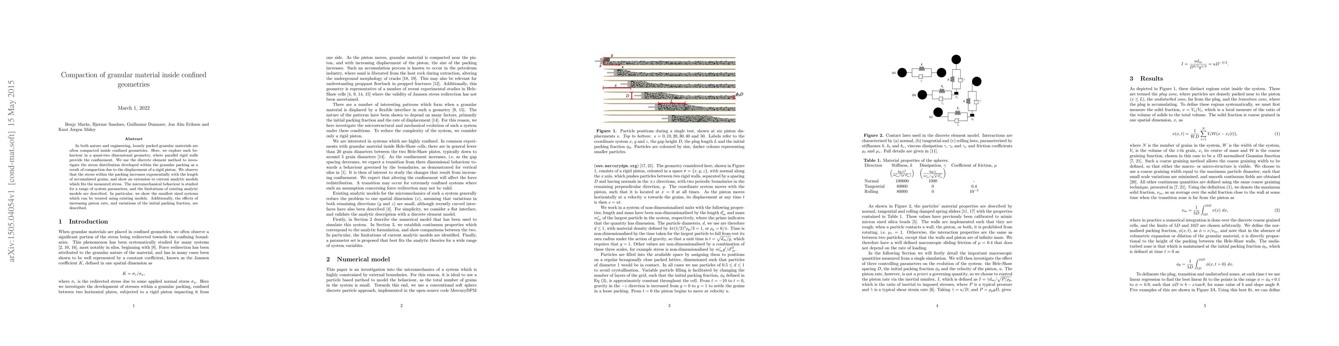 This study uses the discrete element method to examine granular material compaction within confined spaces, revealing exponential stress build-up with grain accumulation. It extends existing analytic models and explores system parameters, piston rate effects, and initial packing fraction variations.