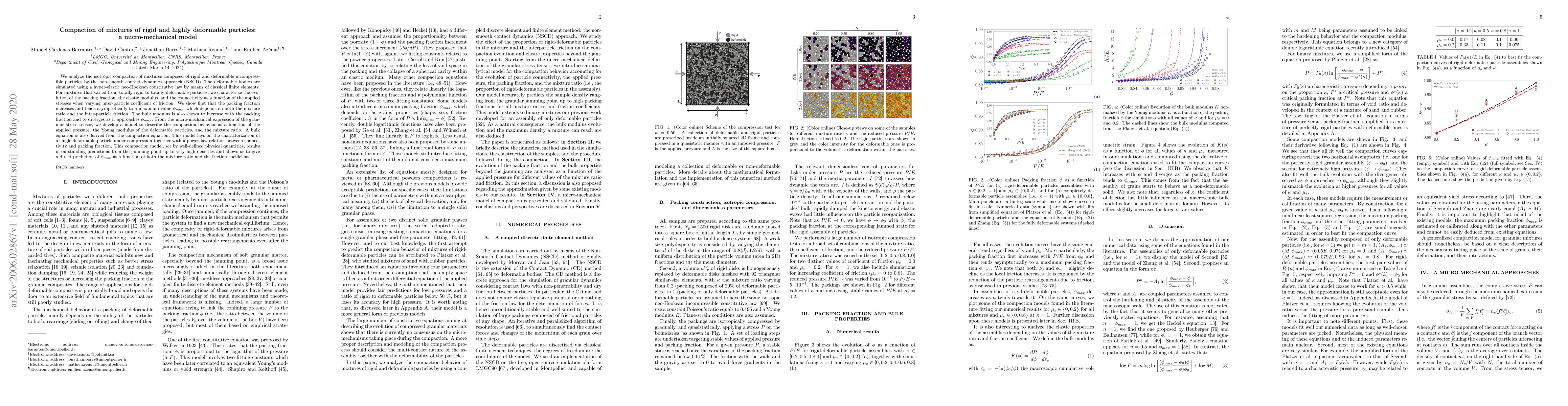 This paper develops a micro-mechanical model using non-smooth contact dynamics to analyze the compaction of mixtures of rigid and deformable particles, showing that the packing fraction increases asymptotically to a maximum value dependent on the mixture ratio and friction coefficient. The model predicts the compaction behavior based on applied pressure, deformable particle modulus, and mixture ratio, providing accurate predictions from jamming to high densities.