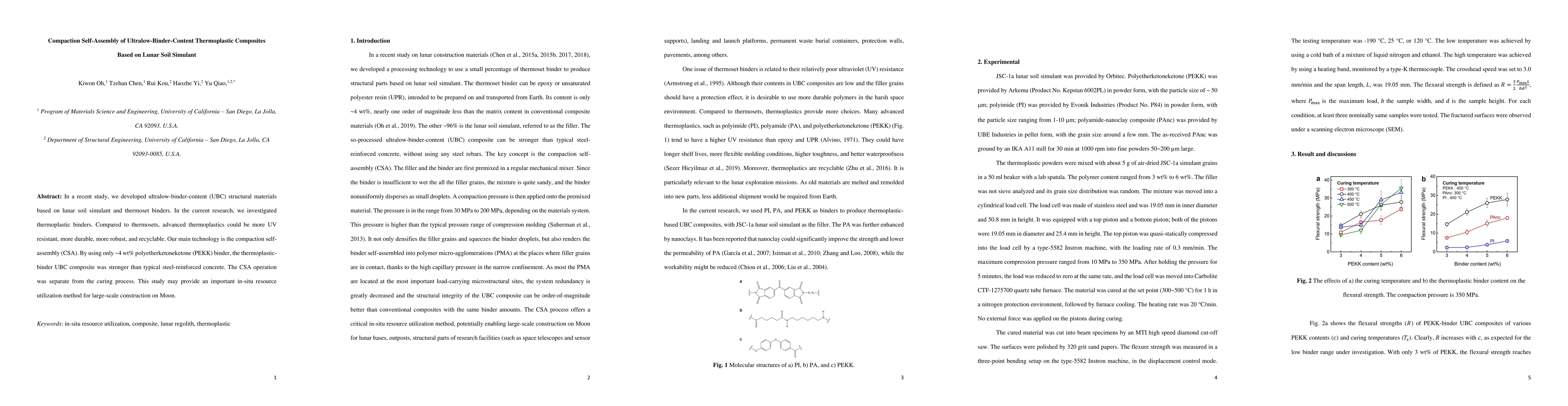In a recent study, we developed ultralow-binder-content (UBC) structural materials based on lunar soil simulant and thermoset binders. In the current research, we investigated thermoplastic binders. Compared to thermosets, advanced thermoplastics could be more UV resistant, more durable, more robust, and recyclable. Our main technology is the compaction self-assembly (CSA). By using only ~4 wt% polyetherketoneketone (PEKK) binder, the thermoplastic-binder UBC composite was stronger than typical steel-reinforced concrete. The CSA operation was separate from the curing process. This study may provide an important in-situ resource utilization method for large-scale construction on Moon.