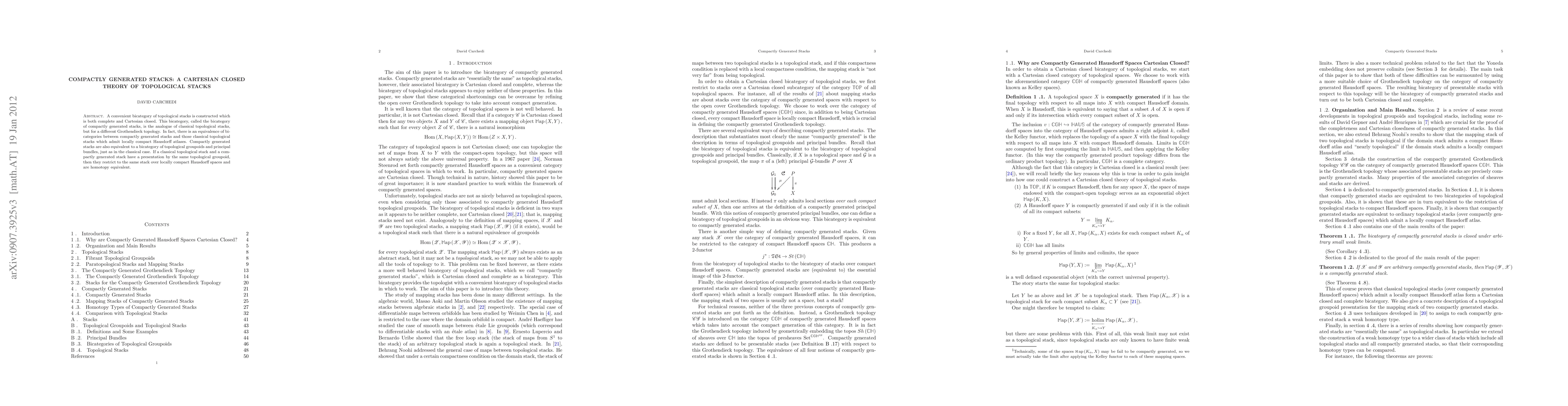 This paper constructs a bicategory of compactly generated stacks, which is complete and Cartesian closed, analogous to classical topological stacks but under a different Grothendieck topology. It establishes equivalences between compactly generated stacks and classical topological stacks with locally compact Hausdorff atlases, as well as with topological groupoids and principal bundles.