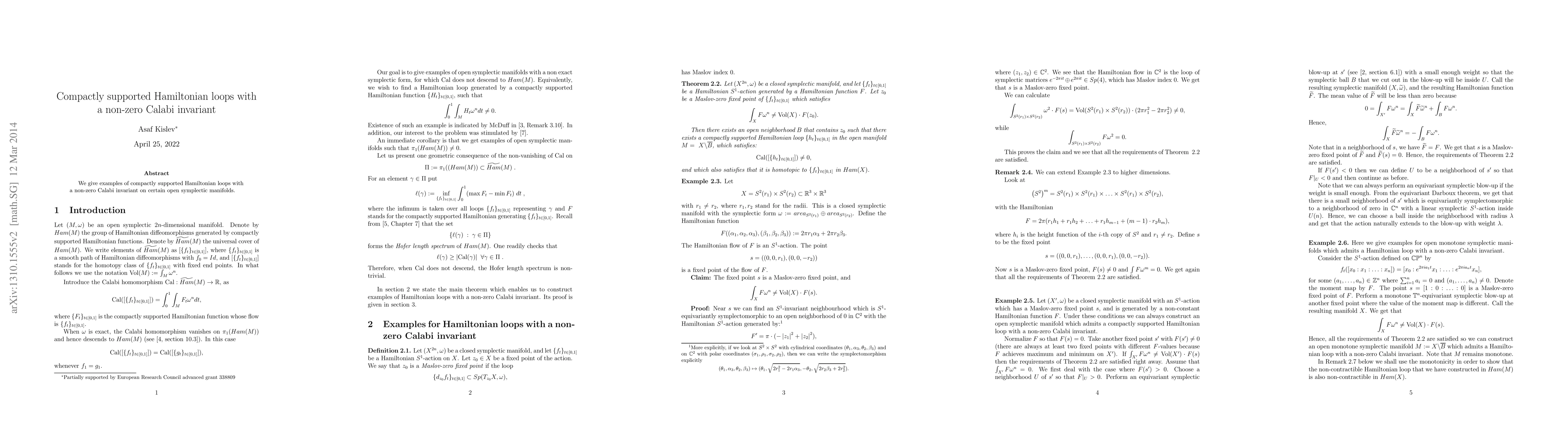 The paper presents examples of compactly supported Hamiltonian loops exhibiting non-zero Calabi invariant on specific open symplectic manifolds, contributing to the understanding of symplectic geometry.