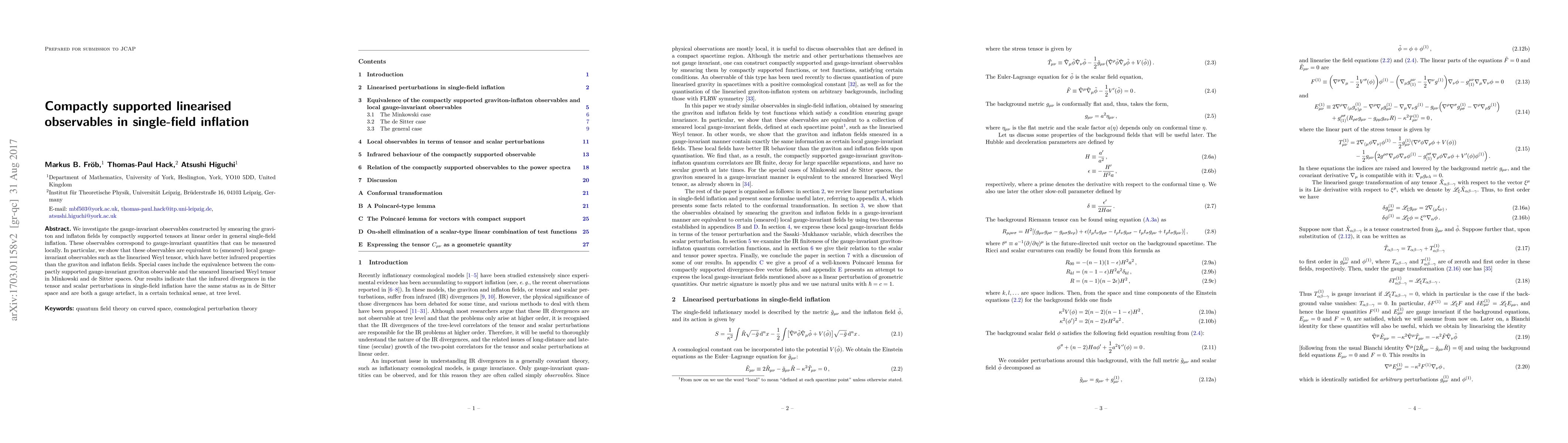 We investigate the gauge-invariant observables constructed by smearing the graviton and inflaton fields by compactly supported tensors at linear order in general single-field inflation. These observables correspond to gauge-invariant quantities that can be measured locally. In particular, we show that these observables are equivalent to (smeared) local gauge-invariant observables such as the linearised Weyl tensor, which have better infrared properties than the graviton and inflaton fields. Special cases include the equivalence between the compactly supported gauge-invariant graviton observable and the smeared linearised Weyl tensor in Minkowski and de Sitter spaces. Our results indicate that the infrared divergences in the tensor and scalar perturbations in single-field inflation have the same status as in de Sitter space and are both a gauge artefact, in a certain technical sense, at tree level.