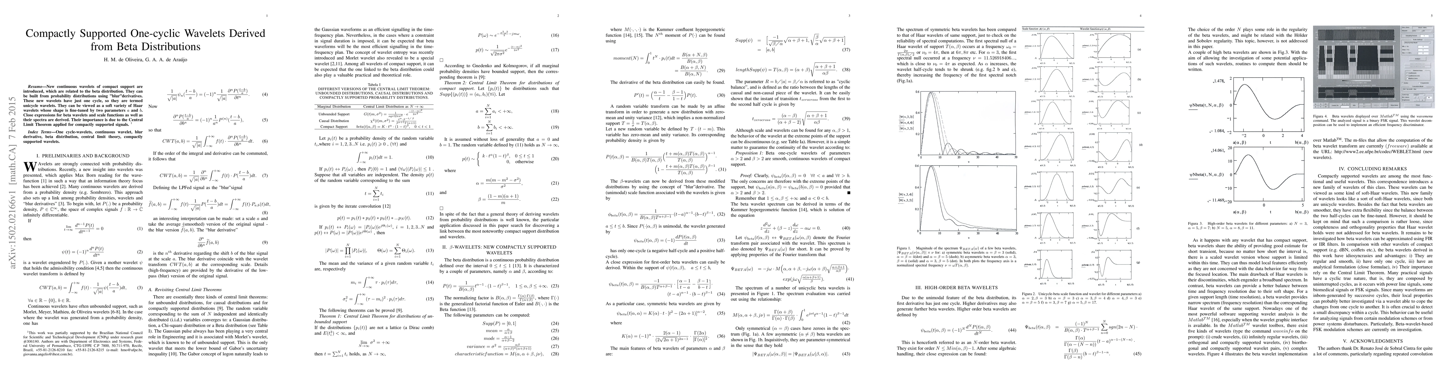 New unicycle wavelets derived from beta distributions offer compact support and are constructed using 'blur' derivatives, providing a flexible alternative to Haar wavelets. These wavelets are valuable due to their relation to the Central Limit Theorem for compactly supported signals.