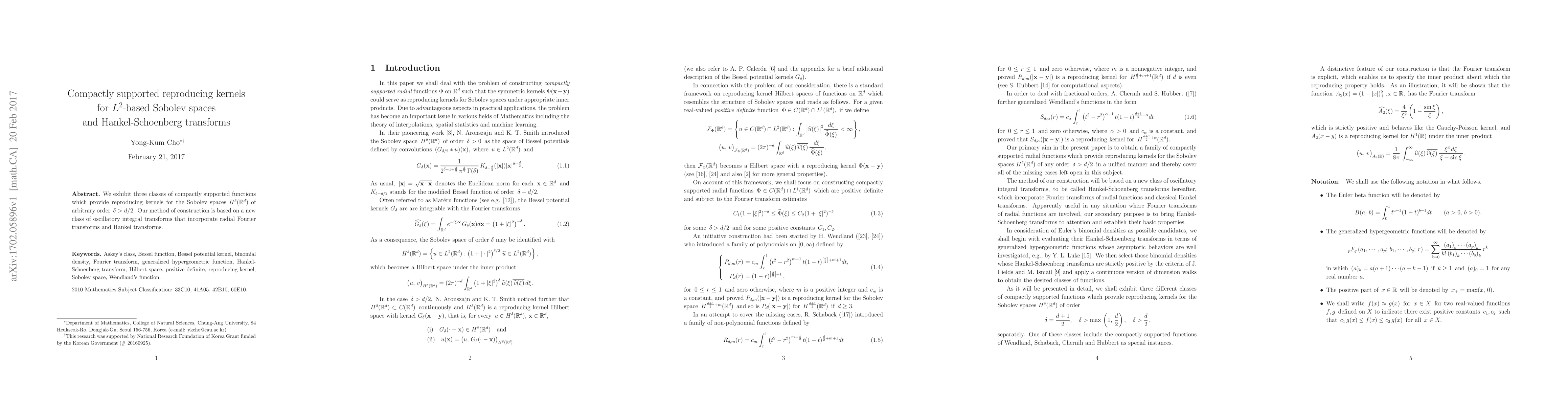 This paper introduces three types of compactly supported functions serving as reproducing kernels for $L^2$-based Sobolev spaces $H^\delta(\R^d)$ of any order $\delta > d/2$. The construction employs a novel class of oscillatory integral transforms combining radial Fourier and Hankel transforms.