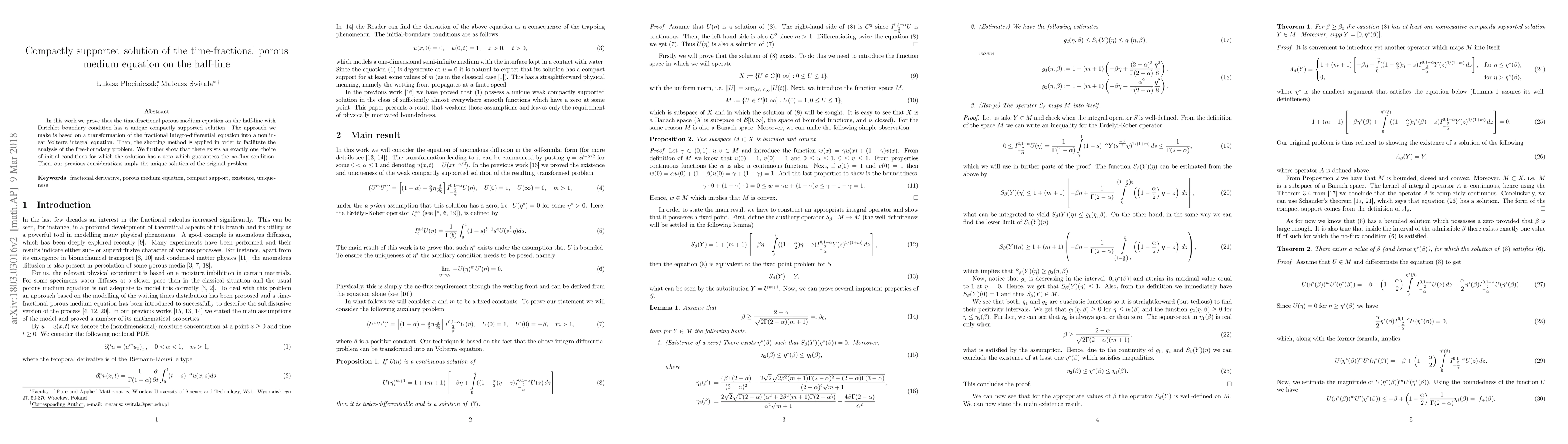 This paper proves the existence of a unique compactly supported solution for the time-fractional porous medium equation on the half-line with Dirichlet boundary conditions. The authors transform the fractional integro-differential equation into a nonlinear Volterra integral equation and apply the shooting method to analyze the free-boundary problem.