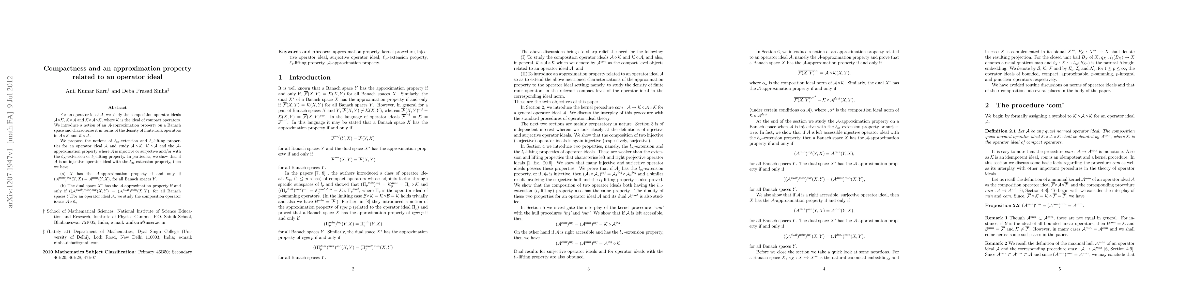 For an operator ideal $\mathcal A$, we study the composition operator ideals ${\mathcal A}\circ{\mathcal K}$, ${\mathcal K}\circ{\mathcal A}$ and ${\mathcal K}\circ{\mathcal A}\circ{\mathcal K}$, where $\mathcal K$ is the ideal of compact operators. We introduce a notion of an $\mathcal A$-approximation property on a Banach space and characterise it in terms of the density of finite rank operators in ${\mathcal A}\circ{\mathcal K}$ and ${\mathcal K}\circ{\mathcal A}$. We propose the notions of $\ell_{\infty}$-extension and $\ell_{1}$-lifting properties for an operator ideal $\mathcal A$ and study ${\mathcal A}\circ{\mathcal K}$, ${\mathcal}\circ{\mathcal A}$ and the $\mathcal A$-approximation property where $\mathcal A$ is injective or surjective and/or with the $\ell_{\infty}$-extension or $\ell_{1}$-lifting property. In particular, we show that if $\mathcal A$ is an injective operator ideal with the $\ell_\infty$-extension property, then we have: (a) $X$ has the $\mathcal A$-approximation property if and only if $({\mathcal A}^{min})^{inj}(Y,X)={\mathcal A}^{min}(Y,X)$, for all Banach spaces $Y$. (b) The dual space $X^*$ has the $\mathcal A$-approximation property if and only if $(({\mathcal A}^{dual})^{min})^{sur}(X,Y)=({\mathcal A}^{dual})^{min}(X,Y)$, for all Banach spaces $Y$.}For an operator ideal $\mathcal A$, we study the composition operator ideals ${\mathcal A}\circ{\mathcal K}$,