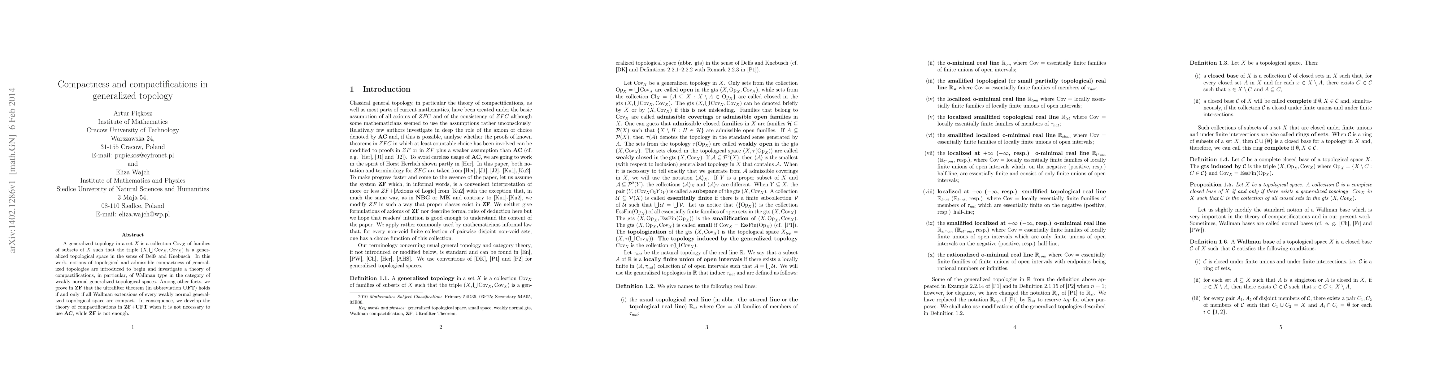 This paper introduces compactness notions in generalized topology and proves that ultrafilter theorem holds if and only if all Wallman extensions of weakly normal spaces are compact, developing a theory of compactifications without using the Axiom of Choice.