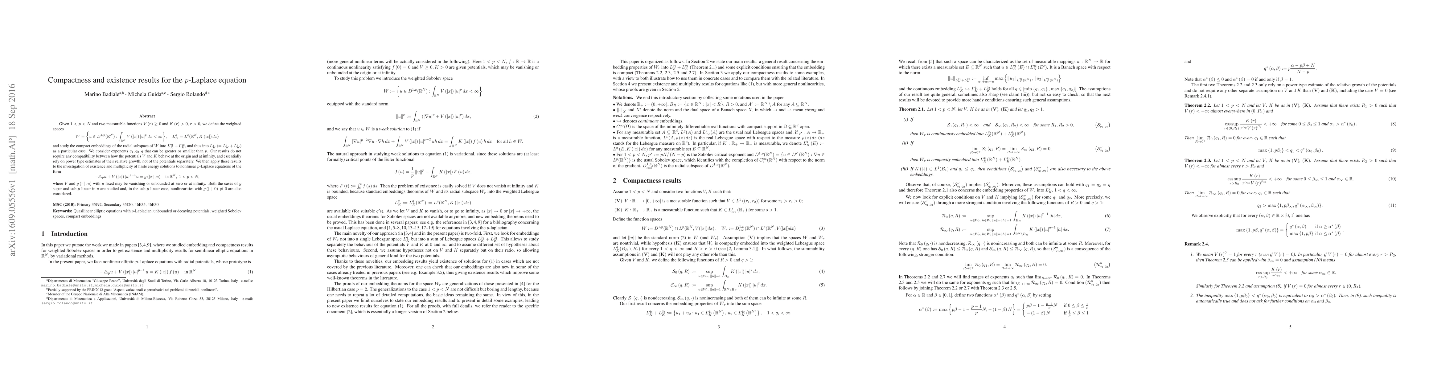 0$, $r>0$, we define the weighted spaces \[ W=\left\{ u\in D^{1,p}(\mathbb{R}^{N}):\int_{\mathbb{R}^{N}}V\left( \left| x\right| \right) \left| u\right| ^{p}dx<\infty \right\} ,\quad L_{K}^{q}=L^{q}(\mathbb{R}^{N},K\left( \left| x\right| \right) dx) \] and study the compact embeddings of the radial subspace of $W$ into $L_{K}^{q_{1}}+L_{K}^{q_{2}}$, and thus into $L_{K}^{q}$ ($=L_{K}^{q}+L_{K}^{q}$) as a particular case. We consider exponents $q_{1},q_{2},q$ that can be greater or smaller than $p$. Our results do not require any compatibility between how the potentials $V$ and $K$ behave at the origin and at infinity, and essentially rely on power type estimates of their relative growth, not of the potentials separately. We then apply these results to the investigation of existence and multiplicity of finite energy solutions to nonlinear $p$-Laplace equations of the form \[ -\triangle _{p}u+V\left( \left| x\right| \right) |u|^{p-1}u=g\left( \left| x\right| ,u\right) \quad \text{in }\mathbb{R}^{N},\ 1