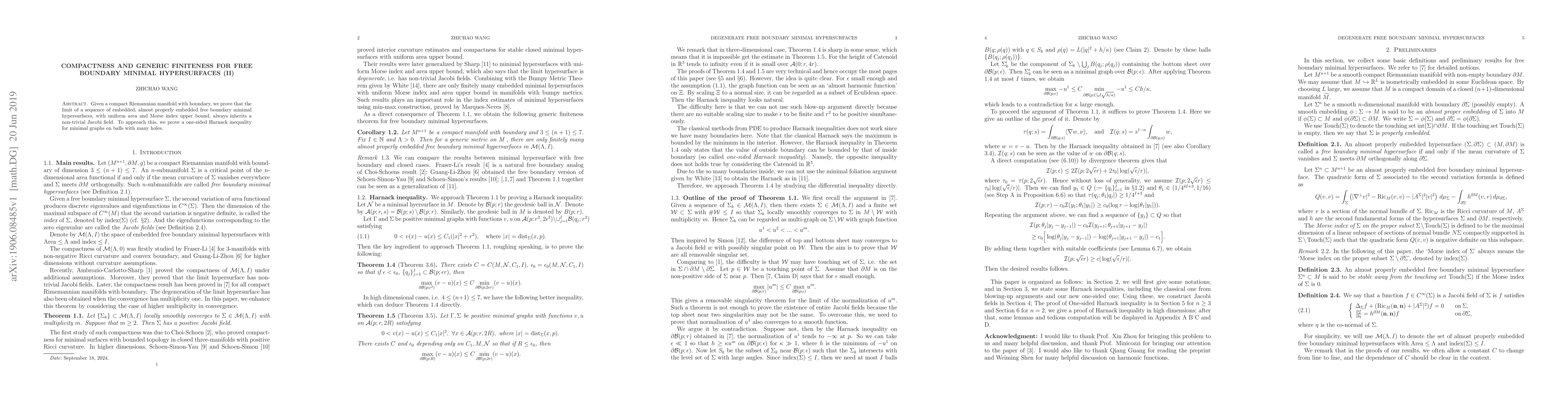 Given a compact Riemannian manifold with boundary, we prove that the limit of a sequence of embedded, almost properly embedded free boundary minimal hypersurfaces, with uniform area and Morse index upper bound, always inherits a non-trivial Jacobi field. To approach this, we prove a one-sided Harnack inequality for minimal graphs on balls with many holes.