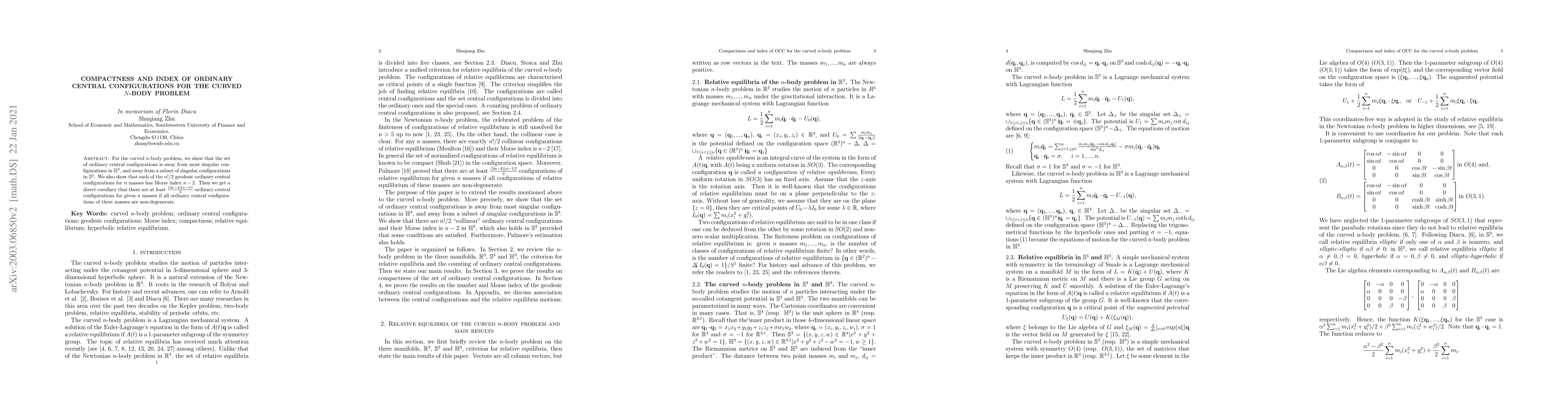 For the curved n-body problem, we show that the set of ordinary central configurations is away from most singular configurations in H^3, and away from a subset of singular configurations in S^3. We also show that each of the n!/2 geodesic ordinary central configurations for n masses has Morse index n-2. Then we get a direct corollary that there are at least (3n-4)(n-1)!/2 ordinary central configurations for given n masses if all ordinary central configurations of these masses are non-degenerate.