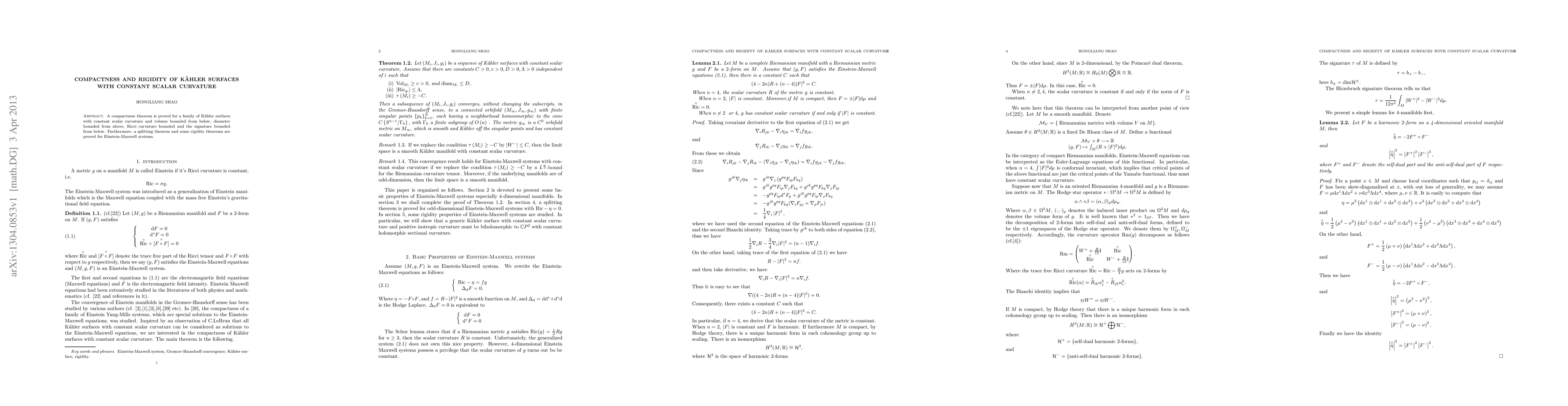 This paper proves a compactness theorem for Kähler surfaces with constant scalar curvature, under constraints on volume, diameter, Ricci curvature, and signature. It also establishes a splitting theorem and rigidity results for Einstein-Maxwell systems.