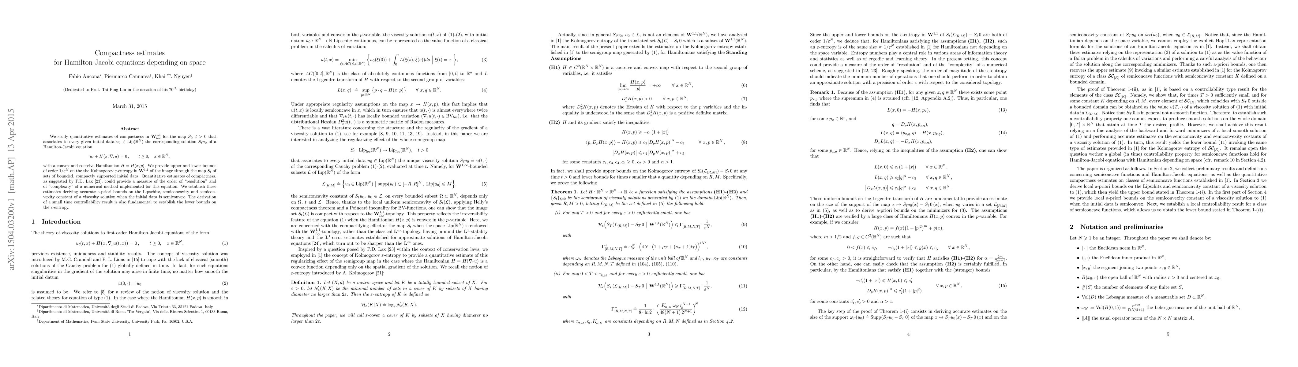 This paper investigates compactness estimates in $\mathbf{W}^{1,1}_{loc}$ for the map $S_t$ associated with solutions of Hamilton-Jacobi equations, providing upper and lower bounds on the Kolmogorov $\varepsilon$-entropy. These estimates help measure the resolution and complexity of numerical methods for solving the equations.
