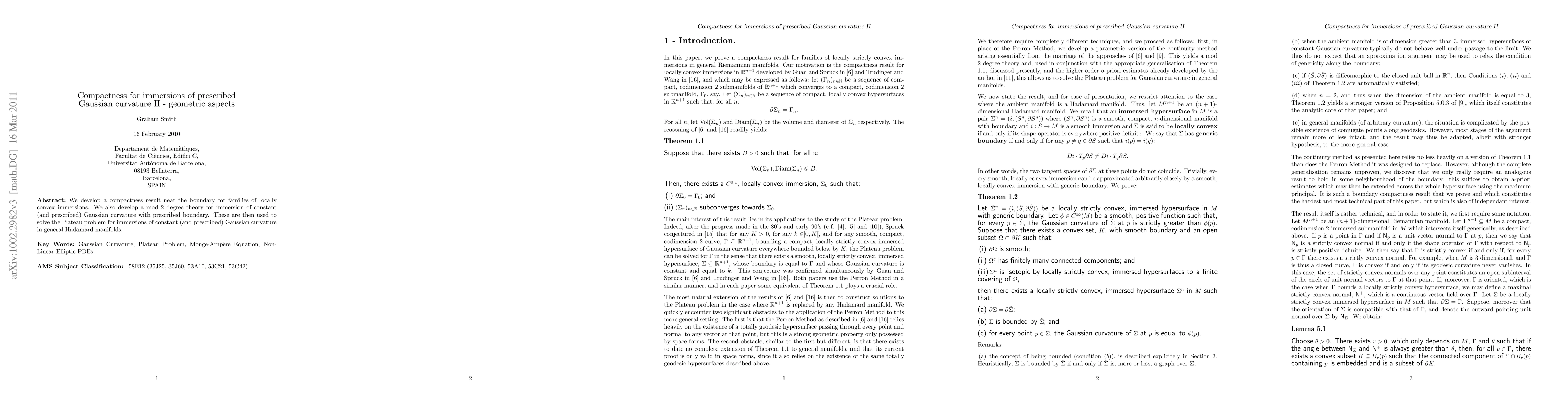 We develop a compactness result near the boundary for families of locally convex immersions. We also develop a mod 2 degree theory for immersion of constant (and prescribed) Gaussian curvature with prescribed boundary. These are then used to solve the Plateau problem for immersions of constant (and prescribed) Gaussian curvature in general Hadamard manifolds.