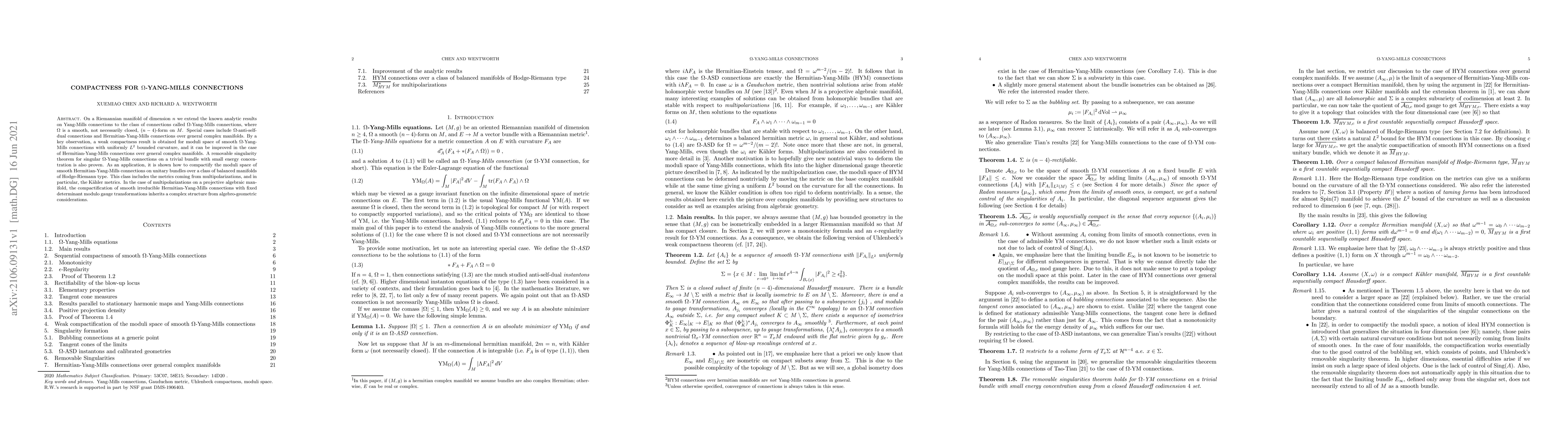 On a Riemannian manifold of dimension $n$ we extend the known analytic results on Yang-Mills connections to the class of connections called $\Omega$-Yang-Mills connections, where $\Omega$ is a smooth, not necessarily closed, $(n-4)$-form. Special cases include $\Omega$-anti-self-dual connections and Hermitian-Yang-Mills connections over general complex manifolds. By a key observation, a weak compactness result is obtained for moduli space of smooth $\Omega$-Yang-Mills connections with uniformly $L^2$ bounded curvature, and it can be improved in the case of Hermitian-Yang-Mills connections over general complex manifolds. A removable singularity theorem for singular $\Omega$-Yang-Mills connections on a trivial bundle with small energy concentration is also proven. As an application, it is shown how to compactify the moduli space of smooth Hermitian-Yang-Mills connections on unitary bundles over a class of balanced manifolds of Hodge-Riemann type. This class includes the metrics coming from multipolarizations, and in particular, the Kaehler metrics. In the case of multipolarizations on a projective algebraic manifold, the compactification of smooth irreducible Hermitian-Yang-Mills connections with fixed determinant modulo gauge transformations inherits a complex structure from algebro-geometric considerations.