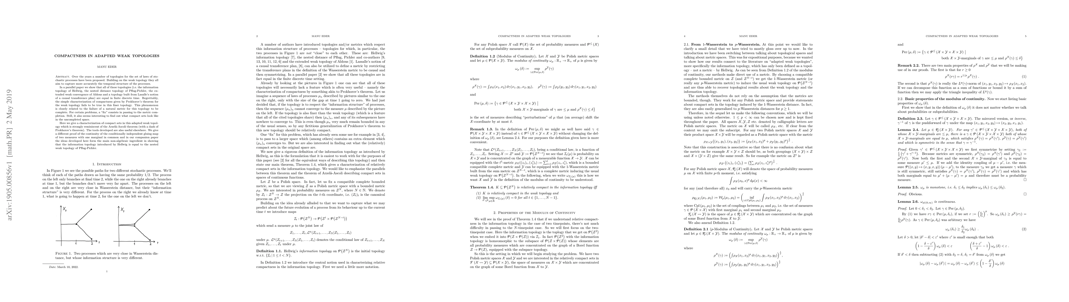 The paper analyzes compactness in adapted weak topologies for laws of stochastic processes, comparing various topologies including Hellwig's information topology, Pflug-Pichler's nested distance topology, Aldous' extended weak convergence, and Lasalle's causal transference plan topology, demonstrating their equivalence in finite discrete time.