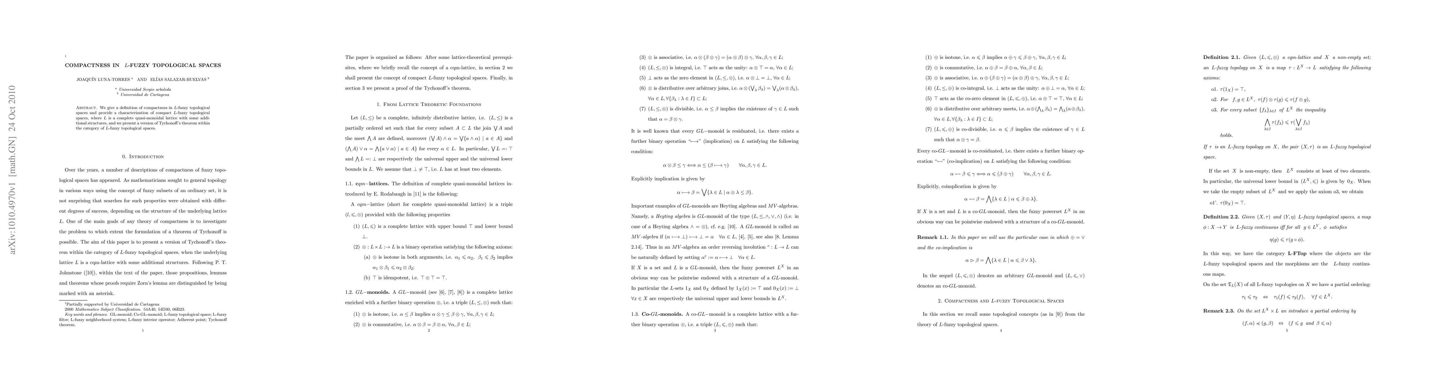 This paper defines compactness in L-fuzzy topological spaces and characterizes compact L-fuzzy topological spaces using a complete quasi-monoidal lattice. It also presents a version of Tychonoff's theorem for these spaces.