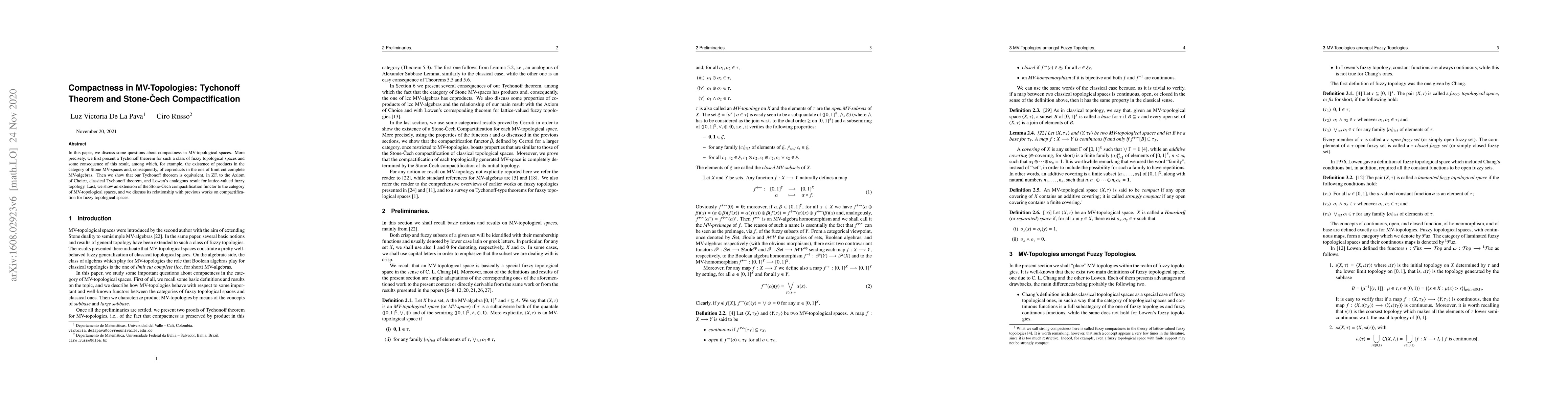 In this paper, we discuss some questions about compactness in MV-topological spaces. More precisely, we first present a Tychonoff theorem for such a class of fuzzy topological spaces and some consequence of this result, among which, for example, the existence of products in the category of Stone MV-spaces and, consequently, of coproducts in the one of limit cut complete MV-algebras. Then we show that our Tychonoff theorem is equivalent, in ZF, to the Axiom of Choice, classical Tychonoff theorem, and Lowen's analogous result for lattice-valued fuzzy topology. Last, we show an extension of the Stone-Cech compactification functor to the category of MV-topological spaces, and we discuss its relationship with previous works on compactification for fuzzy topological spaces.