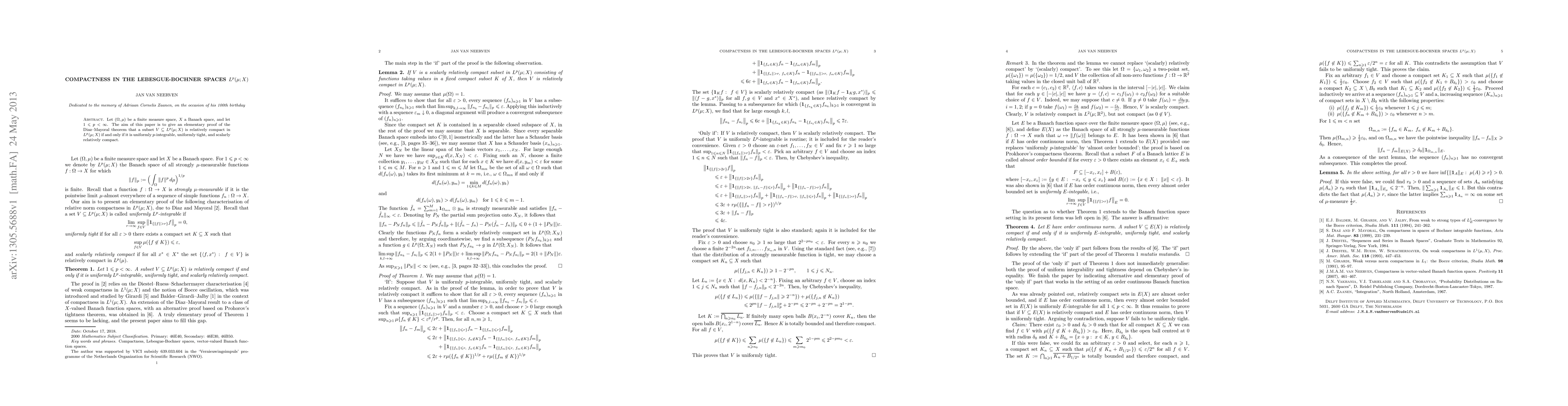 Let (\Omega,\mu) be a finite measure space, X a Banach space, and let 1\le p<\infty. The aim of this paper is to give an elementary proof of the Diaz--Mayoral theorem that a subset V of L^p(\mu;X) is relatively compact if and only if it is uniformly p-integrable, uniformly tight, and scalarly relatively compact.