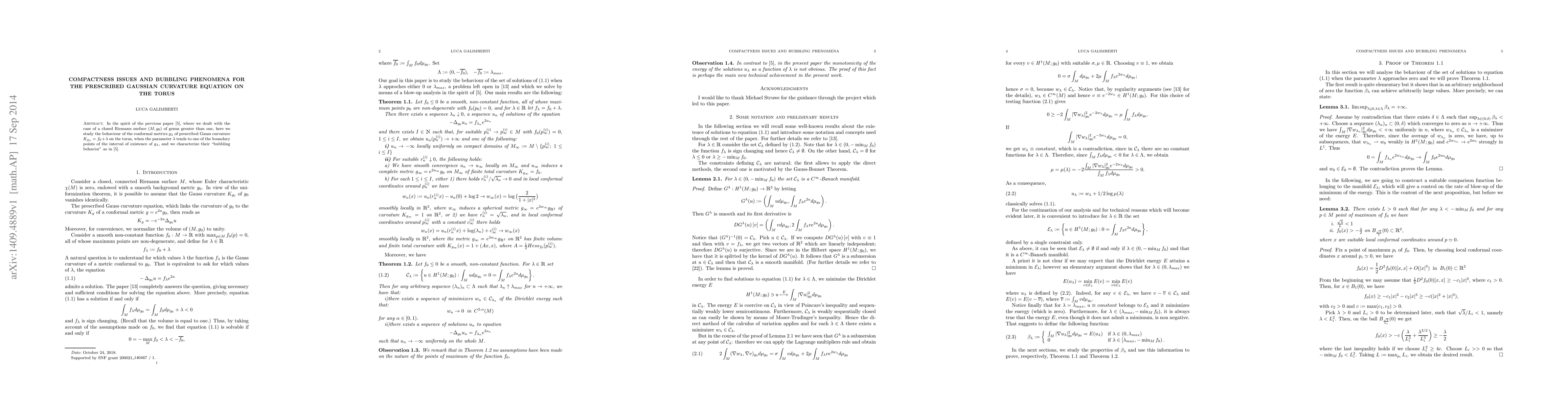 This paper investigates the behavior of conformal metrics on the torus with prescribed Gaussian curvature as the parameter approaches the boundary of existence, focusing on compactness issues and the phenomenon of "bubbling." It extends previous work on higher genus surfaces to the torus.