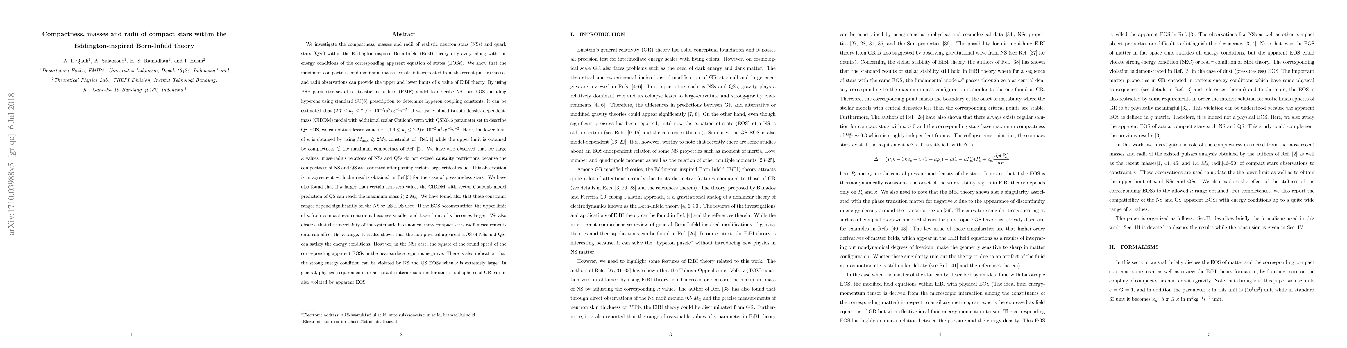 We investigate the compactness, masses and radii of realistic neutron stars (NSs) and quark stars (QSs) within the Eddington-inspired Born-Infeld (EiBI) theory of gravity, and the energy conditions of their apparent equation of states (EOSs). We show that the maximum compactness and maximum masses constraints extracted from the recent pulsars masses and radii observations can provide the upper and lower limits of $\kappa$ value of EiBI theory. By using BSP parameter set of relativistic mean field (RMF) model to describe NS core EOS including hyperons, it can be estimated that $ (2.7 \le \kappa_g \le 7.9) \times$ $\rm 10^{-2} m^5 kg^{-1} s^{-2}$. If we use confined-isospin-density-dependent-mass (CIDDM) model with additional scalar Coulomb term with QSK046 parameter set to describe QS EOS, we can obtain lesser value i.e., $ (1.6 \le \kappa_g\le 2.2) \times$ $\rm 10^{-2} m^5 kg^{-1} s^{-2}$. We have also observed that for large $\kappa$ values, mass-radius relations of NSs and QSs do not exceed causality restrictions because the compactness of NS and QS are saturated after passing certain large critical value. This observation is in agreement with the results obtained in Ref.\cite{Delsate12} for the case of pressure-less stars. We have also found that if $\kappa$ larger than certain non-zero value, the CIDDM with vector Coulomb model prediction of QS can reach the maximum mass $\gtrsim$ 2 $M_\odot$. We have found also that if the NS or QS EOS becomes stiffer, the upper limit of $\kappa$ from compactness constraint becomes smaller and lower limit of $\kappa$ from maximum masses constraint becomes larger. We also observe that the uncertainty of the systematic in canonical mass compact stars radii measurements data can affect the $\kappa$ range. It is also shown that the non-physical apparent EOS of NSs and QSs can satisfy the energy conditions.