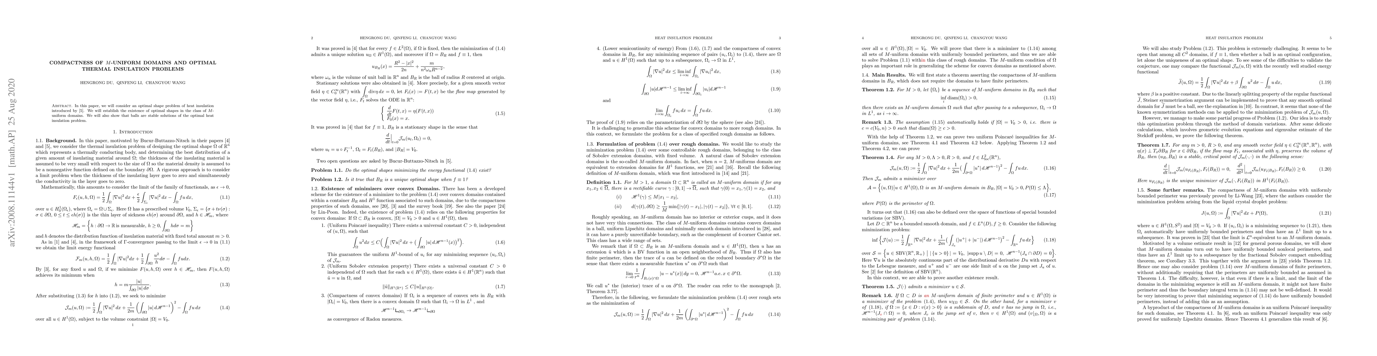 This paper establishes the existence of optimal shapes for heat insulation problems within $M$-uniform domains and demonstrates that balls are stable solutions for these optimal thermal insulation issues.
