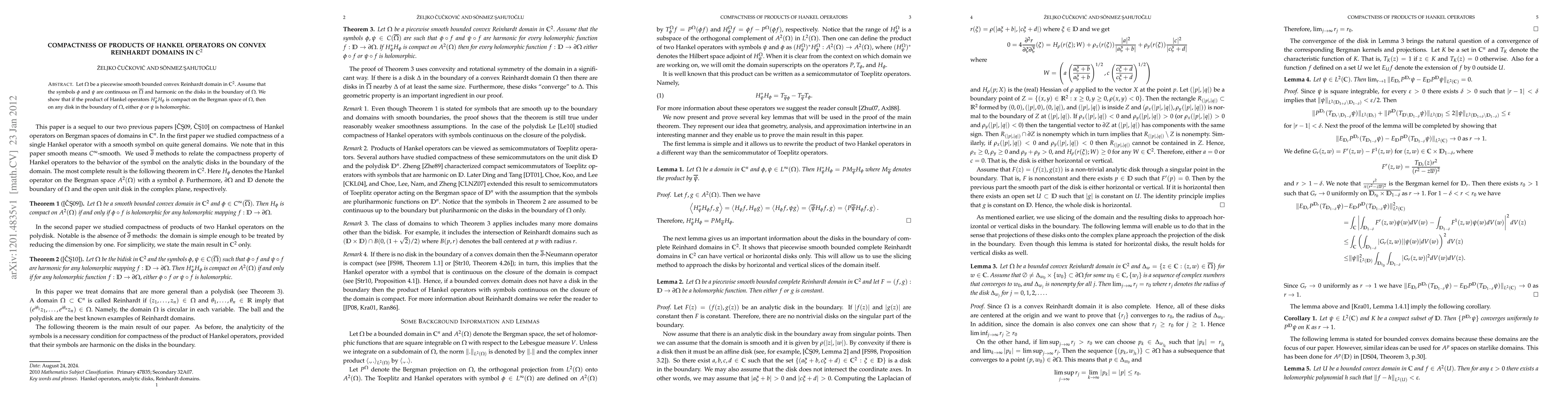 Let D be a piecewise smooth bounded convex Reinhardt domain in C^2. Assume that the symbols f and g are continuous on the closure of D and harmonic on the disks in the boundary of D. We show that if the product of Hankel operators H^*_f H_g is compact on the Bergman space of D, then on any disk in the boundary of D, either f or g is holomorphic.