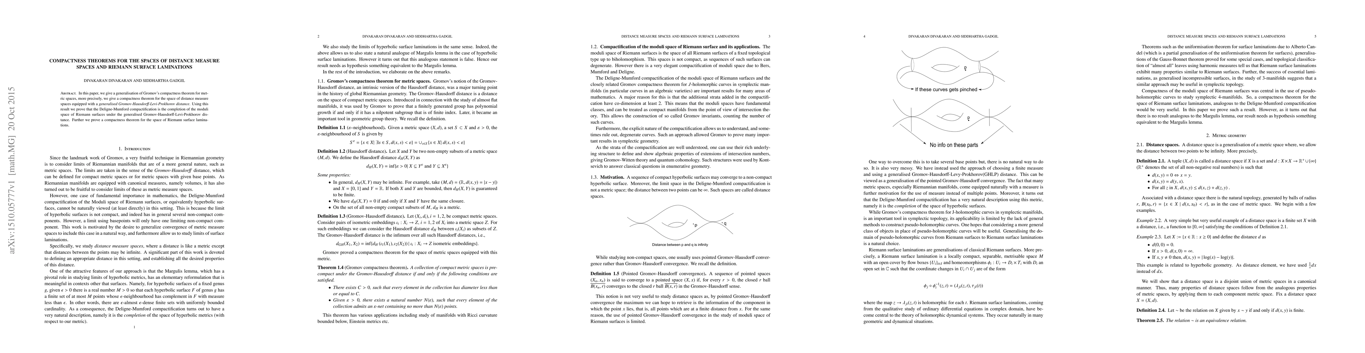 This paper generalises Gromov's compactness theorem for metric spaces by establishing a compactness result for the space of distance measure spaces with a generalised Gromov-Hausdorff-Levi-Prokhorov distance, and uses this to show that the Deligne-Mumford compactification completes the moduli space of Riemann surfaces under this distance. Additionally, it proves a compactness theorem for the space of Riemann surface laminations.
