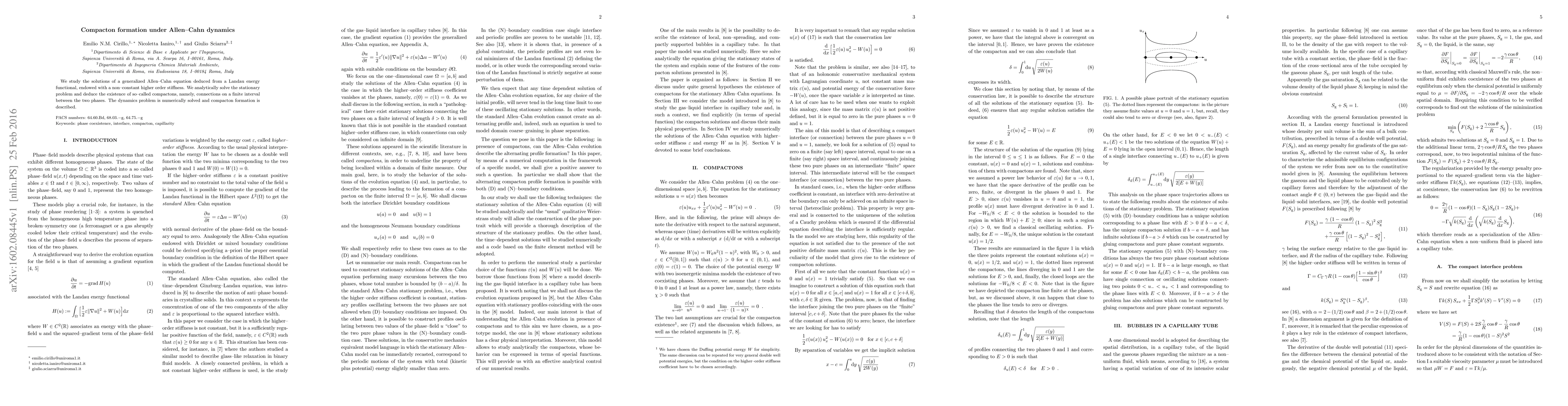 We study the solutions of a generalized Allen-Cahn equation deduced from a Landau energy functional, endowed with a non-constant higher order stiffness. We analytically solve the stationary problem and deduce the existence of so-called compactons, namely, connections on a finite interval between the two phases. The dynamics problem is numerically solved and compacton formation is described.