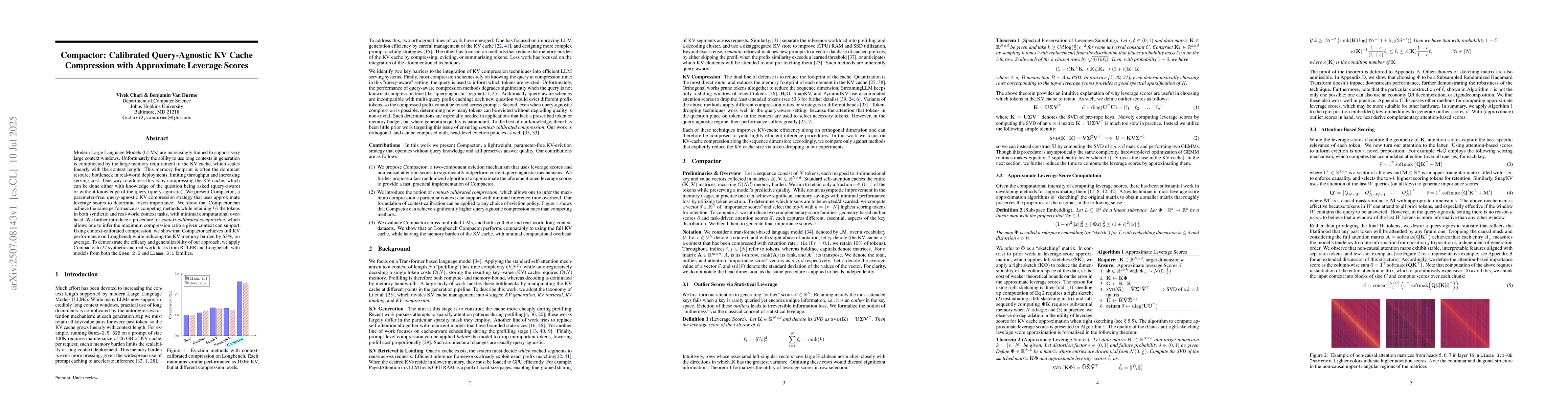 Modern Large Language Models (LLMs) are increasingly trained to support very large context windows. Unfortunately the ability to use long contexts in generation is complicated by the large memory requirement of the KV cache, which scales linearly with the context length. This memory footprint is often the dominant resource bottleneck in real-world deployments, limiting throughput and increasing serving cost. One way to address this is by compressing the KV cache, which can be done either with knowledge of the question being asked (query-aware) or without knowledge of the query (query-agnostic). We present Compactor, a parameter-free, query-agnostic KV compression strategy that uses approximate leverage scores to determine token importance. We show that Compactor can achieve the same performance as competing methods while retaining 1/2 the tokens in both synthetic and real-world context tasks, with minimal computational overhead. We further introduce a procedure for context-calibrated compression, which allows one to infer the maximum compression ratio a given context can support. Using context-calibrated compression, we show that Compactor achieves full KV performance on Longbench while reducing the KV memory burden by 63%, on average. To demonstrate the efficacy and generalizability of our approach, we apply Compactor to 27 synthetic and real-world tasks from RULER and Longbench, with models from both the Qwen 2.5 and Llama 3.1 families.