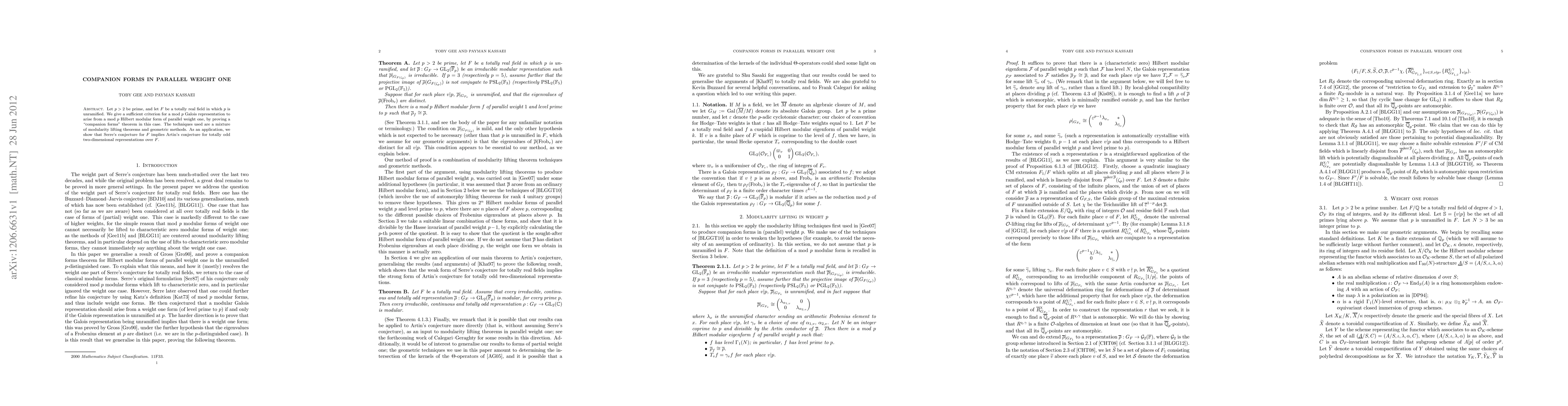 This paper establishes a criterion for mod $p$ Galois representations to stem from mod $p$ Hilbert modular forms of parallel weight one, leveraging a "companion forms" theorem. It combines modularity lifting theorems and geometric methods, and as an application, it demonstrates the implication of Serre's conjecture for Artin's conjecture in the context of totally odd two-dimensional representations.
