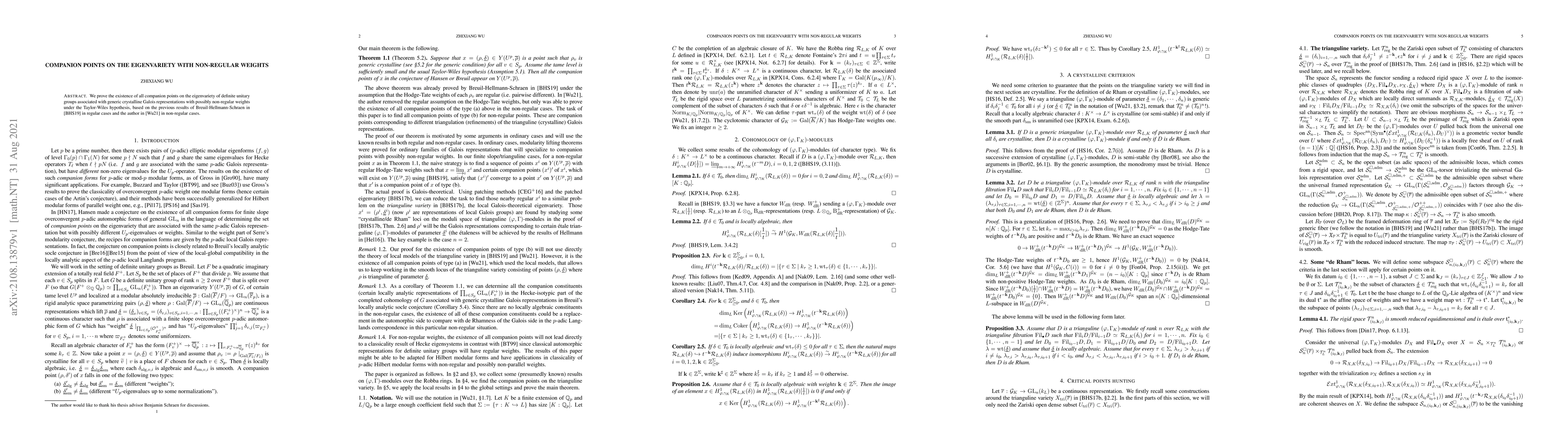 Researchers prove the existence of companion points on the eigenvariety for definite unitary groups under generic crystalline Galois representations with possibly non-regular weights. This breakthrough is based on previous results in regular and non-regular cases.