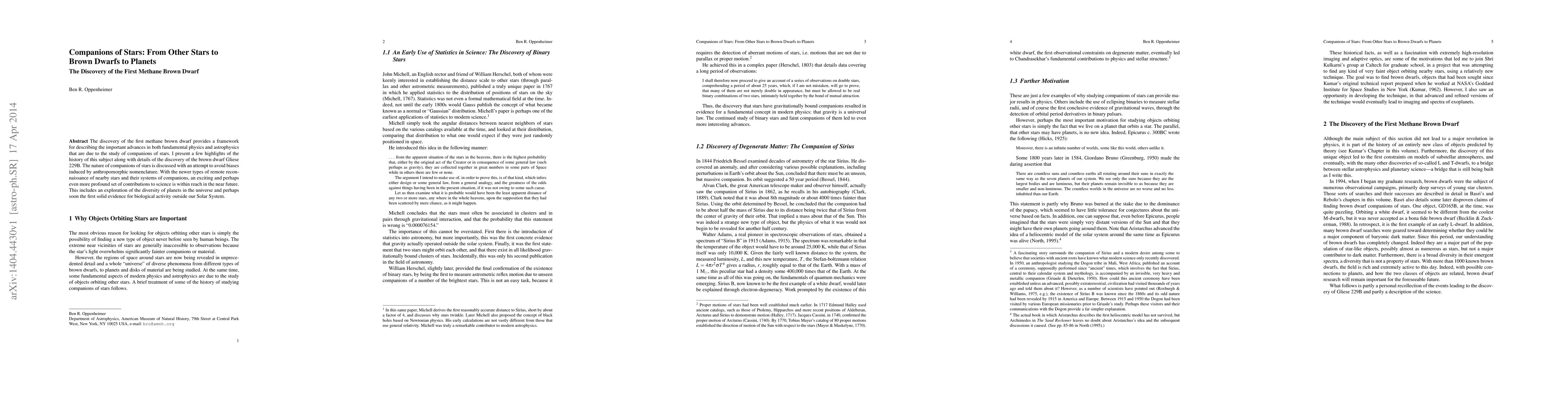 The paper details the discovery of the first methane brown dwarf, Gliese 229B, highlighting advances in astrophysics and fundamental physics. It discusses the broader implications of studying stellar companions and anticipates future scientific breakthroughs, including the exploration of planetary diversity and potential extraterrestrial life.