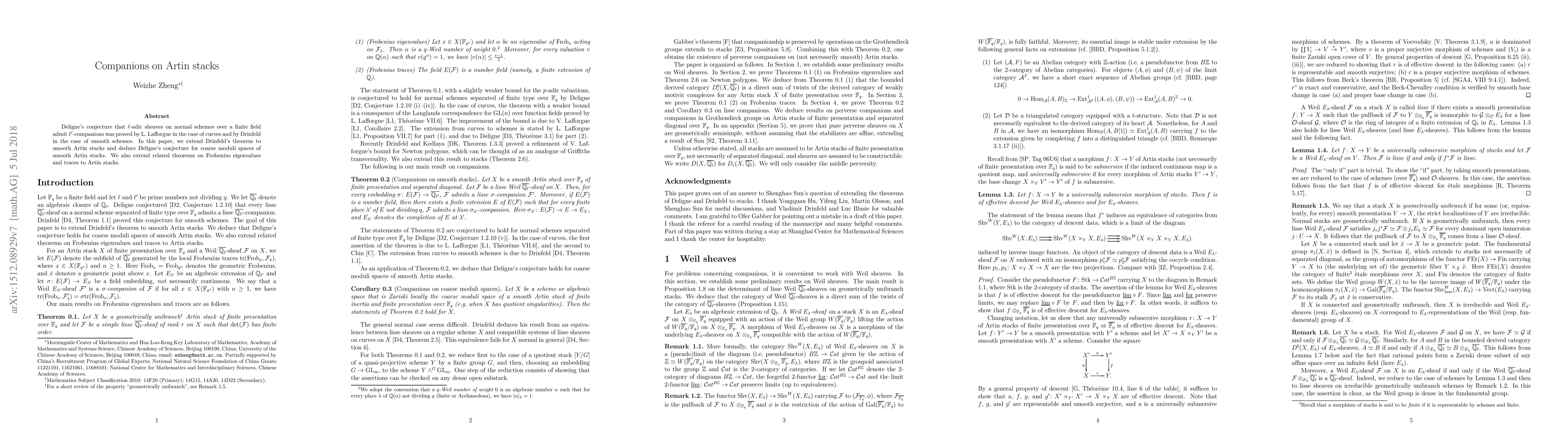 This paper extends Drinfeld's theorem on $\ell'$-companions to smooth Artin stacks, proving Deligne's conjecture for their coarse moduli spaces. It also broadens related results on Frobenius eigenvalues and traces to the context of Artin stacks.
