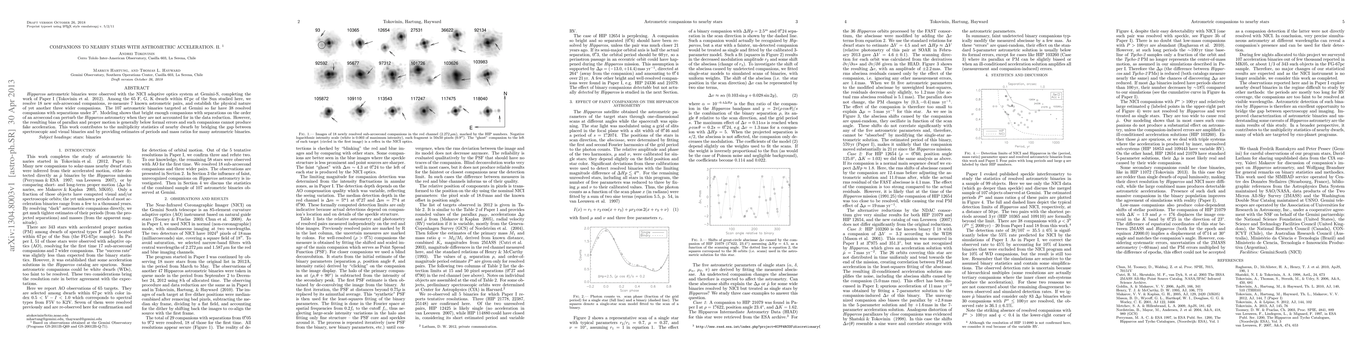 Hipparcos astrometric binaries were observed with the NICI adaptive optics system at Gemini-S, completing the work of Paper I (Tokovinin et al. 2012). Among the 65 F, G, K dwarfs within 67pc of the Sun studied here, we resolve 18 new sub-arcsecond companions, re-measure 7 known astrometric pairs, and establish the physical nature of yet another three wider companions. The 107 astrometric binaries targeted at Gemini so far have 38 resolved companions with separations under 3". Modeling shows that bright enough companions with separations on the order of an arcsecond can perturb the Hipparcos astrometry when they are not accounted for in the data reduction. However, the resulting bias of parallax and proper motion is generally below formal errors and such companions cannot produce fake acceleration. This work contributes to the multiplicity statistics of nearby dwarfs by bridging the gap between spectroscopic and visual binaries and by providing estimates of periods and mass ratios for many astrometric binaries.
