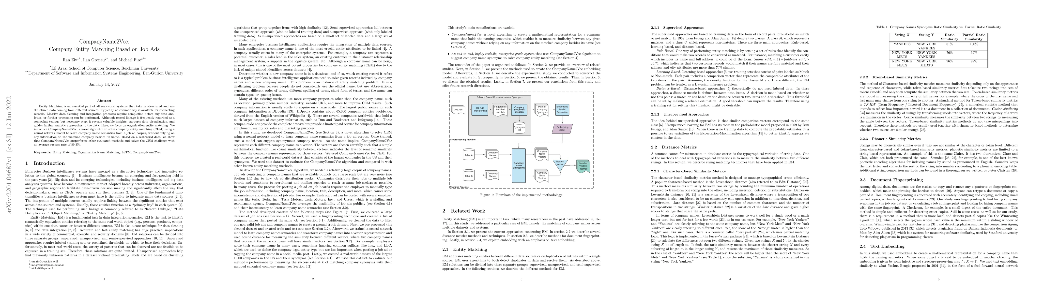 CompanyName2Vec introduces a neural network-based algorithm for company entity matching (CEM) using job ads to learn company name semantics. It achieves an 89.3% success rate, outperforming other methods by leveraging semantic understanding without needing additional company information.