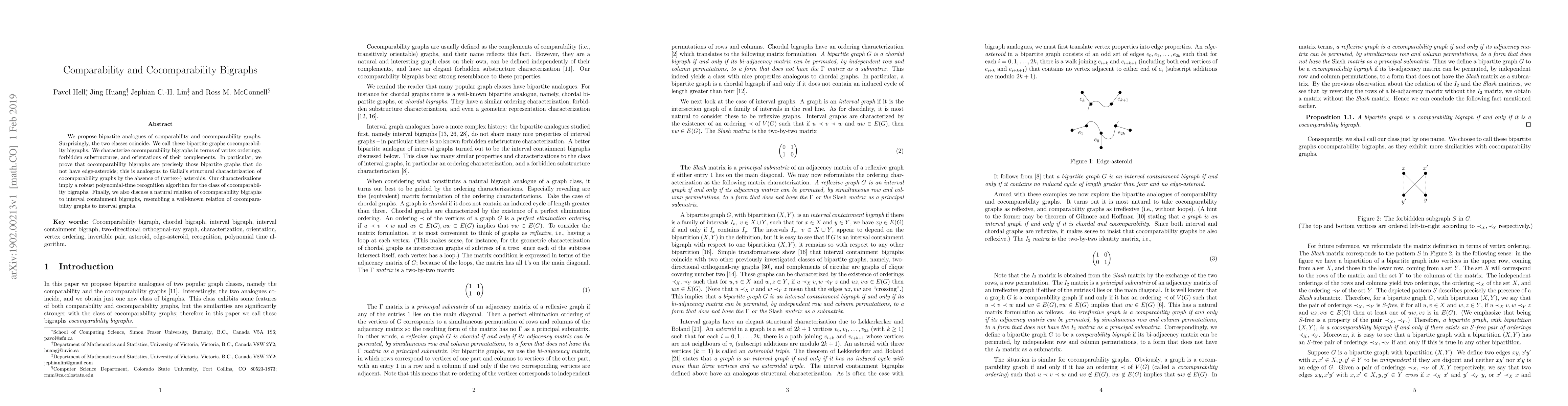 The paper proposes bipartite analogues of comparability and cocomparability graphs, which coincide, leading to the definition of cocomparability bigraphs. Characterizations are provided through vertex orderings, forbidden substructures, and orientations of complements.