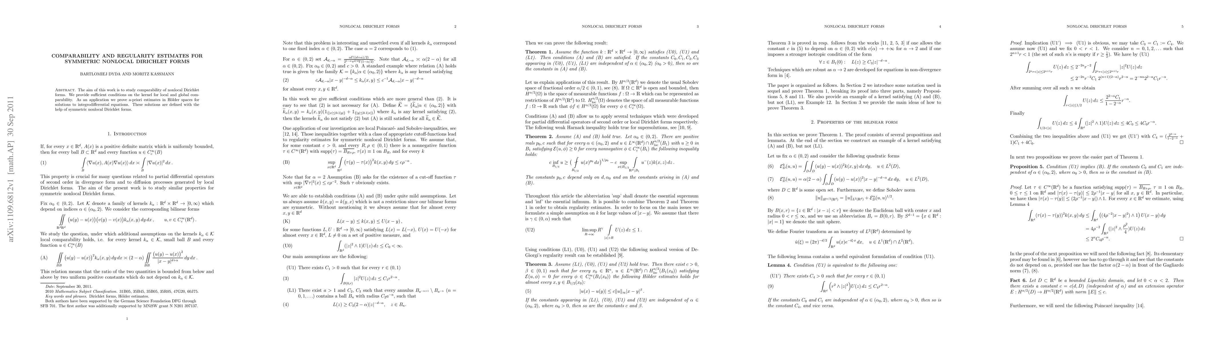 The aim of this work is to study comparability of nonlocal Dirichlet forms. We provide sufficient conditions on the kernel for local and global comparability. As an application we prove a-priori estimates in H\"{o}lder spaces for solutions to integrodifferential equations. These solutions are defined with the help of symmetric nonlocal Dirichlet forms.