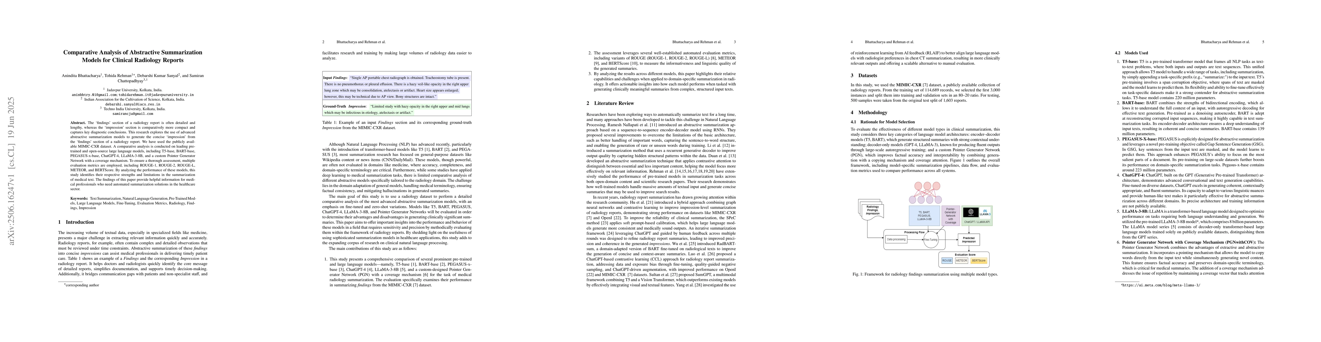 The findings section of a radiology report is often detailed and lengthy, whereas the impression section is comparatively more compact and captures key diagnostic conclusions. This research explores the use of advanced abstractive summarization models to generate the concise impression from the findings section of a radiology report. We have used the publicly available MIMIC-CXR dataset. A comparative analysis is conducted on leading pre-trained and open-source large language models, including T5-base, BART-base, PEGASUS-x-base, ChatGPT-4, LLaMA-3-8B, and a custom Pointer Generator Network with a coverage mechanism. To ensure a thorough assessment, multiple evaluation metrics are employed, including ROUGE-1, ROUGE-2, ROUGE-L, METEOR, and BERTScore. By analyzing the performance of these models, this study identifies their respective strengths and limitations in the summarization of medical text. The findings of this paper provide helpful information for medical professionals who need automated summarization solutions in the healthcare sector.