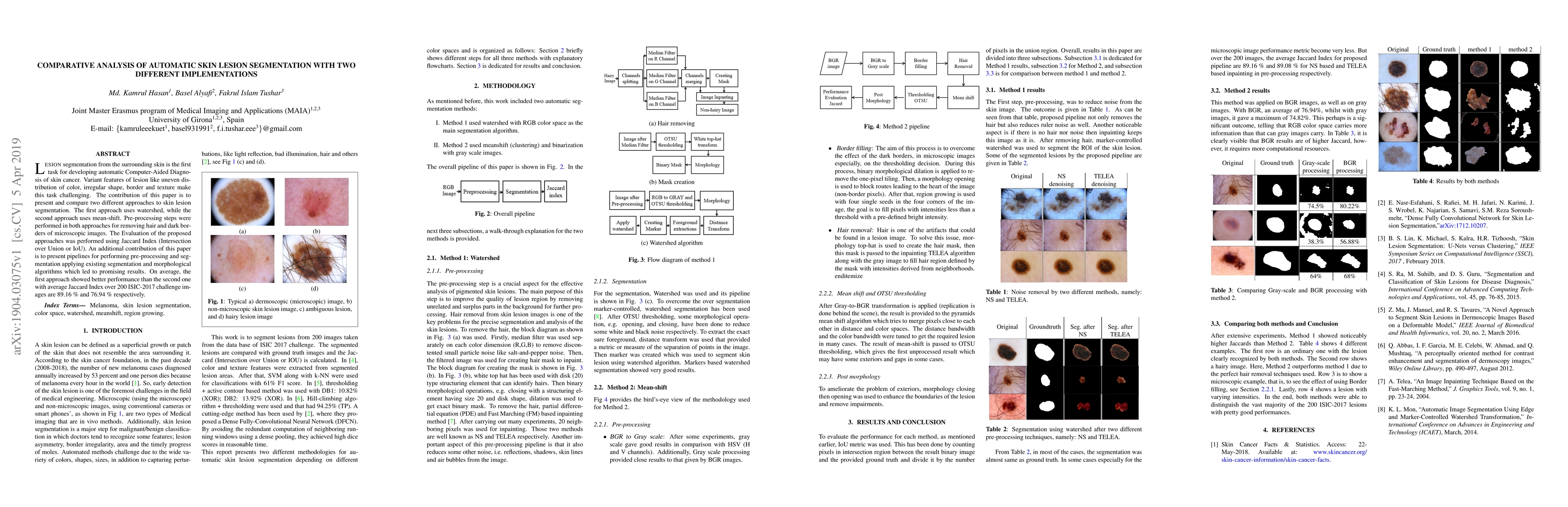 Lesion segmentation from the surrounding skin is the first task for developing automatic Computer-Aided Diagnosis of skin cancer. Variant features of lesion like uneven distribution of color, irregular shape, border and texture make this task challenging. The contribution of this paper is to present and compare two different approaches to skin lesion segmentation. The first approach uses watershed, while the second approach uses mean-shift. Pre-processing steps were performed in both approaches for removing hair and dark borders of microscopic images. The Evaluation of the proposed approaches was performed using Jaccard Index (Intersection over Union or IoU). An additional contribution of this paper is to present pipelines for performing pre-processing and segmentation applying existing segmentation and morphological algorithms which led to promising results. On average, the first approach showed better performance than the second one with average Jaccard Index over 200 ISIC-2017 challenge images are 89.16% and 76.94% respectively.
