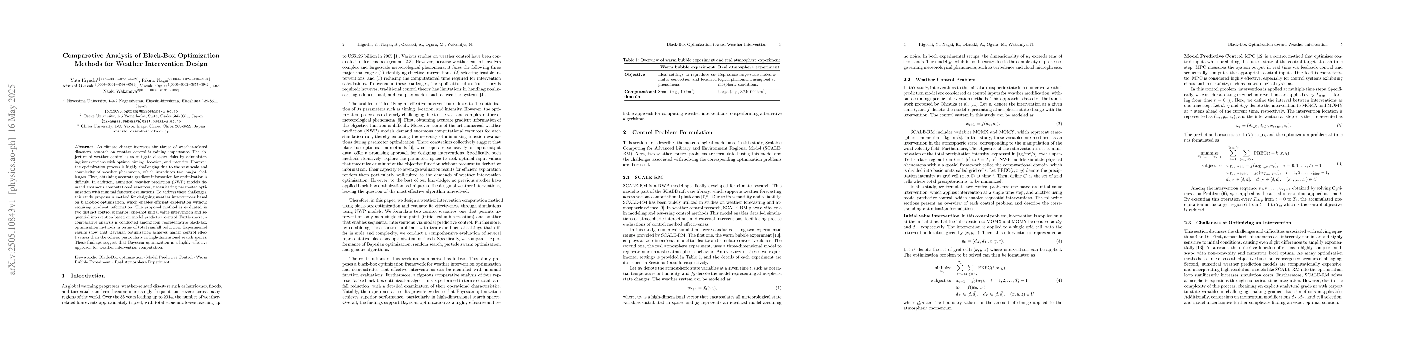 As climate change increases the threat of weather-related disasters, research on weather control is gaining importance. The objective of weather control is to mitigate disaster risks by administering interventions with optimal timing, location, and intensity. However, the optimization process is highly challenging due to the vast scale and complexity of weather phenomena, which introduces two major challenges. First, obtaining accurate gradient information for optimization is difficult. In addition, numerical weather prediction (NWP) models demand enormous computational resources, necessitating parameter optimization with minimal function evaluations. To address these challenges, this study proposes a method for designing weather interventions based on black-box optimization, which enables efficient exploration without requiring gradient information. The proposed method is evaluated in two distinct control scenarios: one-shot initial value intervention and sequential intervention based on model predictive control. Furthermore, a comparative analysis is conducted among four representative black-box optimization methods in terms of total rainfall reduction. Experimental results show that Bayesian optimization achieves higher control effectiveness than the others, particularly in high-dimensional search spaces. These findings suggest that Bayesian optimization is a highly effective approach for weather intervention computation.
