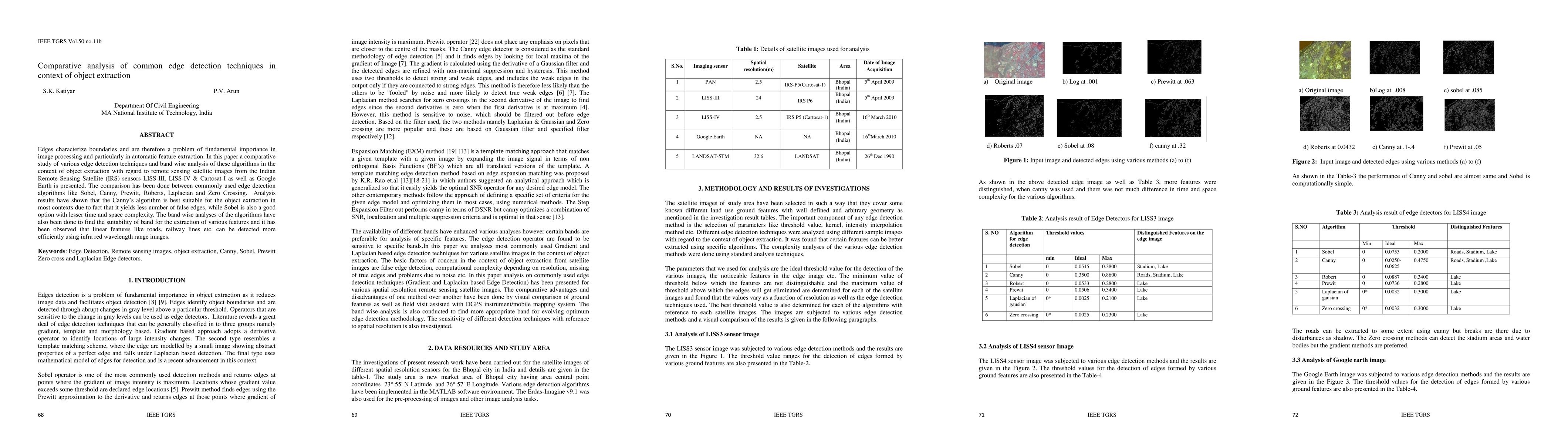 Edges characterize boundaries and are therefore a problem of practical importance in remote sensing.In this paper a comparative study of various edge detection techniques and band wise analysis of these algorithms in the context of object extraction with regard to remote sensing satellite images from the Indian Remote Sensing Satellite (IRS) sensors LISS 3, LISS 4 and Cartosat1 as well as Google Earth is presented.