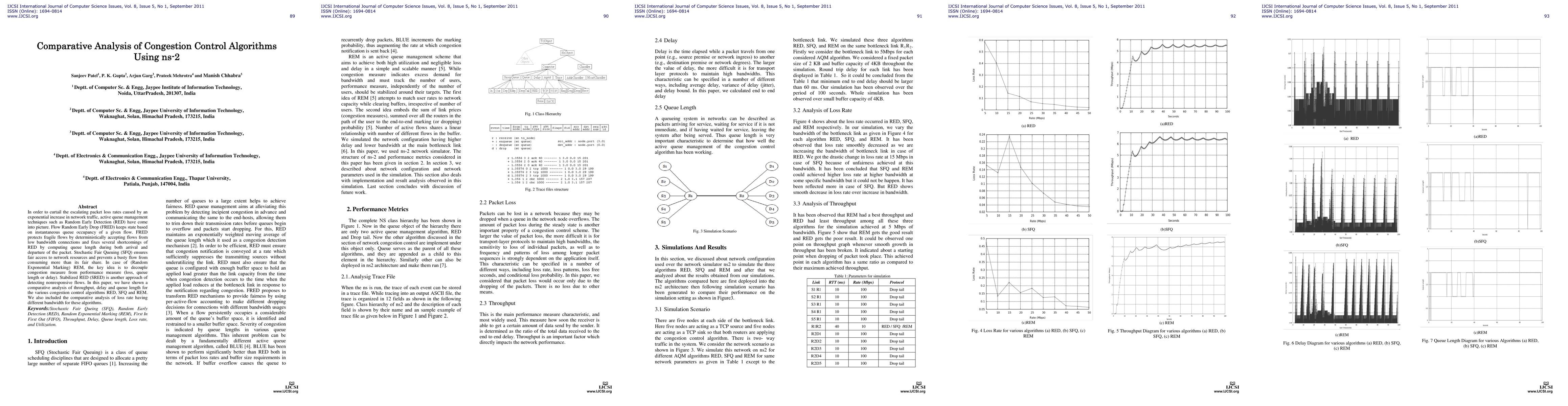 This paper conducts a comparative analysis of congestion control algorithms RED, SFQ, and REM using ns-2, focusing on throughput, delay, queue length, and loss rate under varying bandwidth conditions. The study highlights the performance improvements of FRED and SRED over traditional RED.