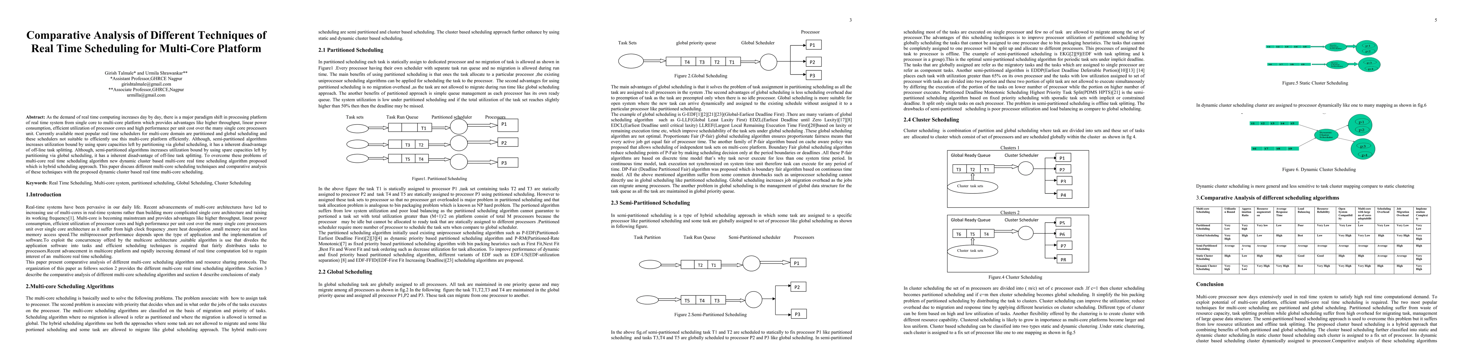 This paper compares various real-time scheduling techniques for multi-core platforms, highlighting the limitations of existing partitioned and global scheduling methods. It proposes a new dynamic cluster based hybrid scheduling approach to better utilize multi-core resources and offers a comparative analysis of different scheduling techniques.