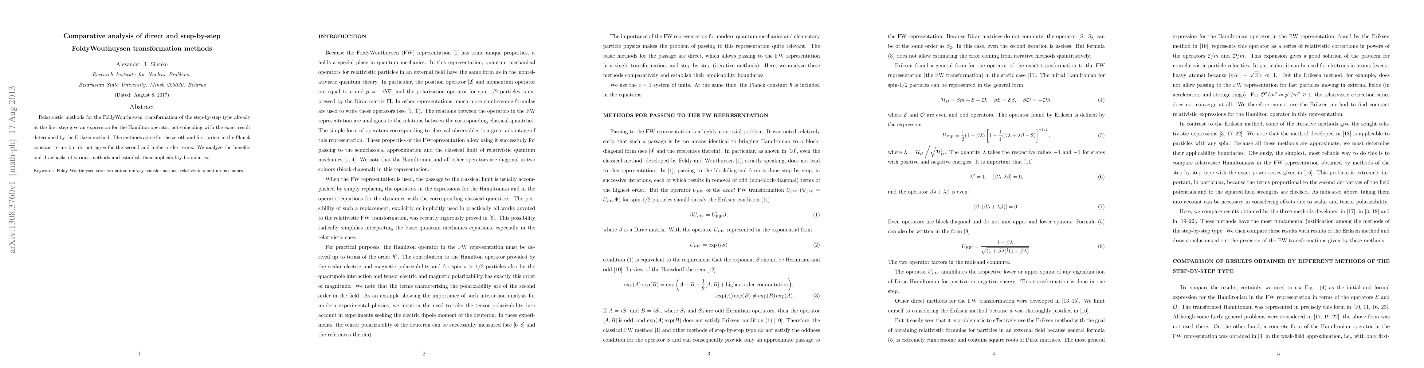 Relativistic methods for the Foldy-Wouthuysen transformation of the ``step-by-step'' type already at the first step give an expression for the Hamilton operator not coinciding with the exact result determined by the Eriksen method. The methods agree for the zeroth and first orders in the Planck constant terms but do not agree for the second and higher-order terms. We analyze the benefits and drawbacks of various methods and establish their applicability boundaries.